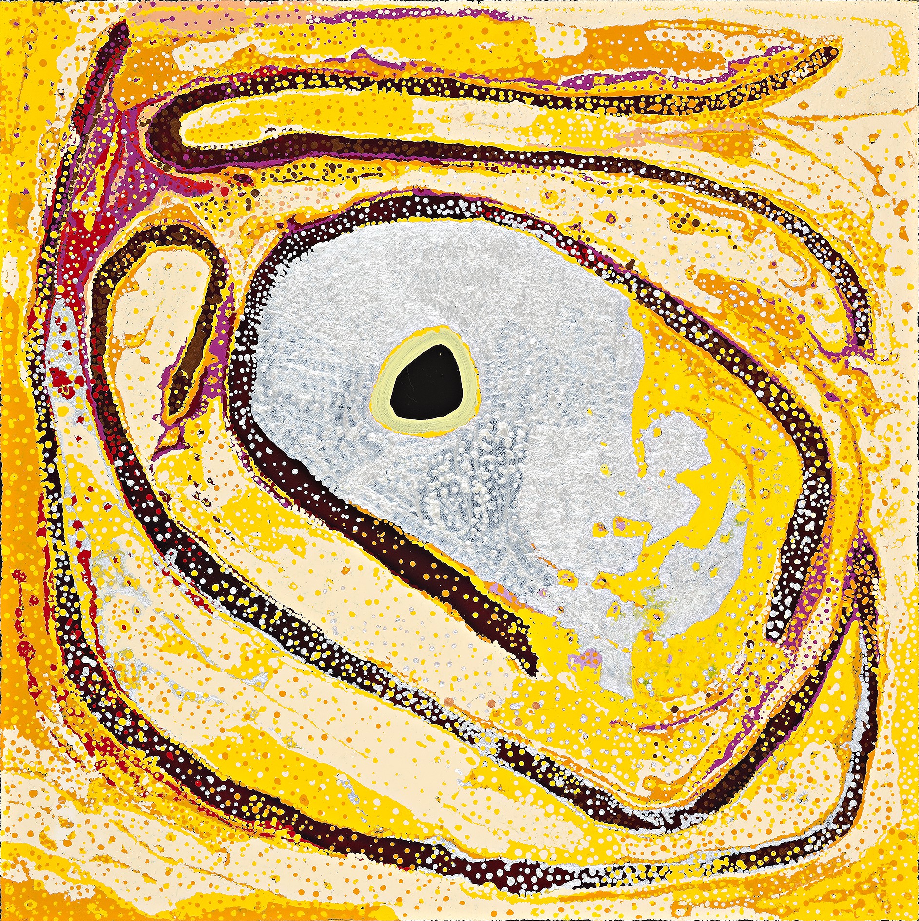 This work is accompanied by a certificate from Short St. Gallery which states: ‘Daniel’s painting reflects the complex desert landscape full of life and colour. He depicts salt lakes (white areas) and the talis (sand hills). Kirriwirri is the birthplace of my father’s family it is the family home. “My father along with his older siblings spent their childhood and adolescents here. Kirriwirri is also important to many other family and clan groups because it is a living jila meaning it has water that never dries out even during the driest of seasons. I have never been to Kirriwirri but I have a deep desire with in to travel and see this country to become connected.”’