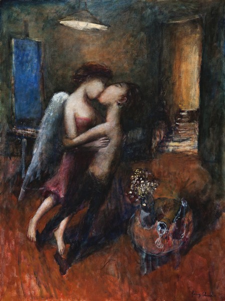 The muse in The Kiss is iridescent, elevating her presence to a greater spiritual dimension. The encounter is magical and emotionally charged, unattached to neither reality nor any known place. The pair seemingly float in a Chagall-like daydream, with the sensuous charm and beauty of the muse intensified by her alluring dress and luminous skin. The couple are engaged in a trance, spellbound by their private moment and blissfully unaware of their audience. The viewer becomes voyeur, embarking on a clandestine journey into the seductive interior spaces imagined by Shead. The intimate interiors of The Artist and Muse series feature background staircases bathed in warm light, and windows filled with panoramic blue landscapes, alluding to idle paths of escape. The Kiss is an unabashedly pure exploration of the sensuality of Erato, and a testament to the unwavering union between Shead and his angel-winged Muse.