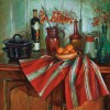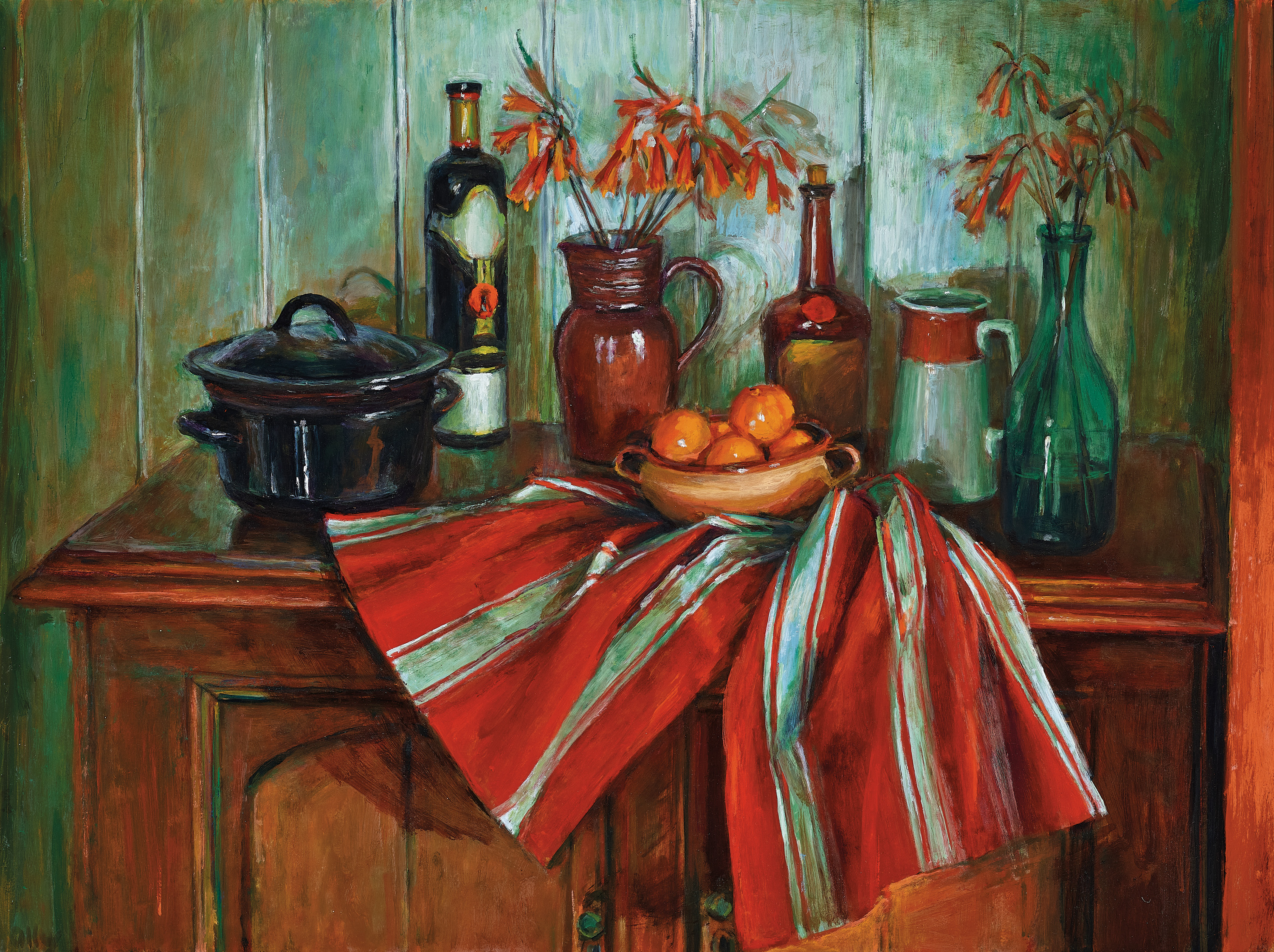 Painted just prior to the artist’s departure for a sojourn to Asia, United States and the United Kingdom in 1981 (during which she eagerly attended exhibitions of her artistic mentors Henri Matisse and Giorgio Morandi), Kitchen Cupboard and Christmas Bells, c.1981 is a superb example of Olley’s masterful manipulation of light and space. Featuring the distinctive red and yellow native flowers in a stoneware jug, balanced alongside various wine bottles, a ceramic stove pot and bowl of mandarins atop the rustic wooden kitchen cupboard, the composition is deliberately nonchalant, with the fruit bowl casually resting upon the folded red and white striped cloth as if the artist had just placed the items there only moments before. However, this ambience conceals a carefully considered orchestration of space. Arranged and rearranged like props in a theatre set, the objects in Olley’s paintings were meticulously placed and, in time, became as acquainted to viewers as they were to the artist herself. The double-handled earthenware fruit bowl, green glass vase, jug and striped tablecloth are all recurring ‘characters’ on her stage, imbued with the stories and memories of her colourful life. As Barry Pearce elucidates in the catalogue accompanying the artist’s retrospective at the Art Gallery of New South Wales in 1996, there is more to Olley’s paintings than a mere still-life – we are invited into her personal domain: ‘Darkness and light, fertility and decay, space and time, tragedy and comedy, solitude, camaraderie; all the things we know and imagine about life and humanity can be gathered at her table within the rooms of her world.’3