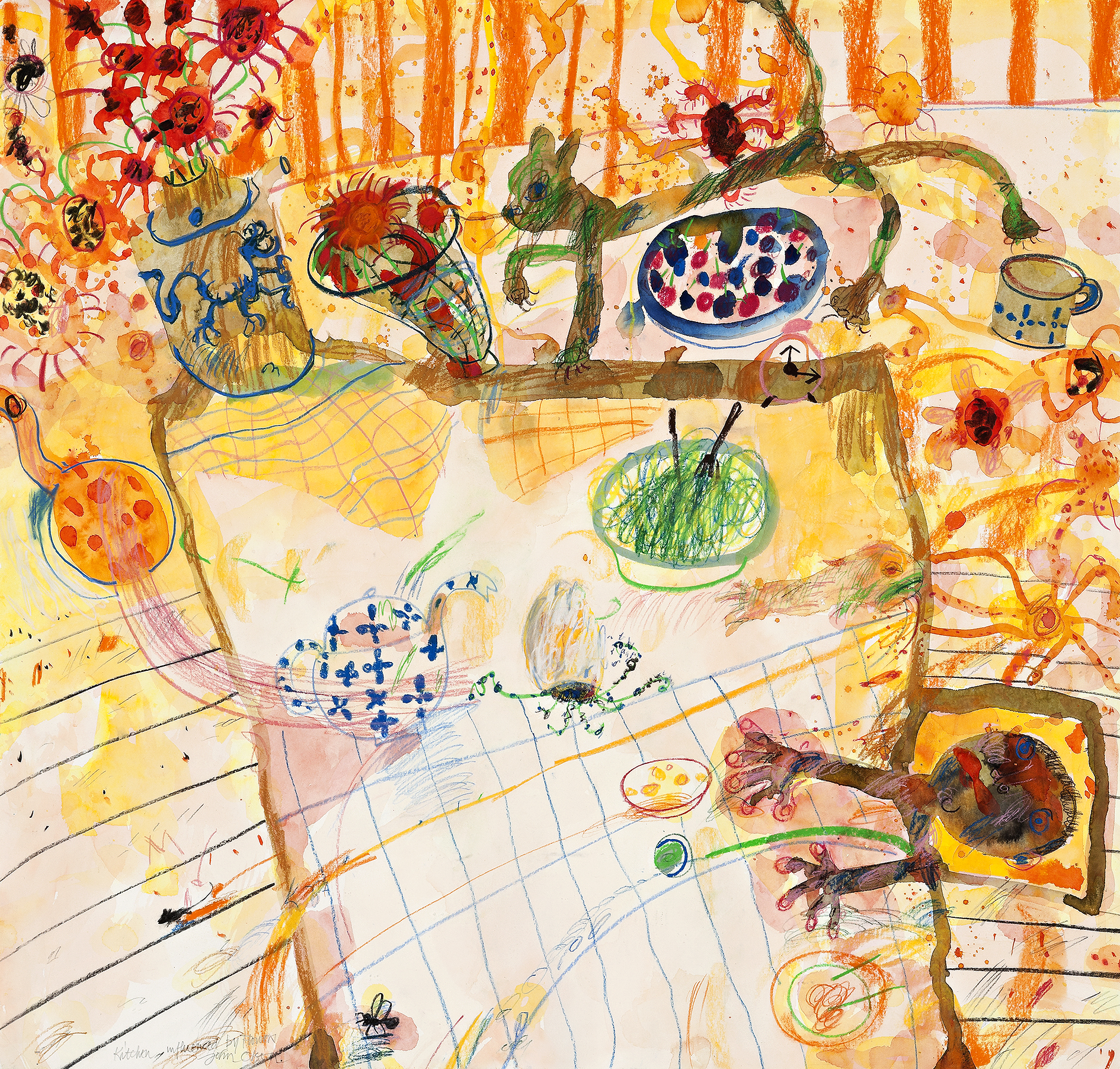 signed and inscribed lower left: Kitchen Influenced by Flowers / John Olsen