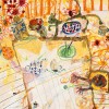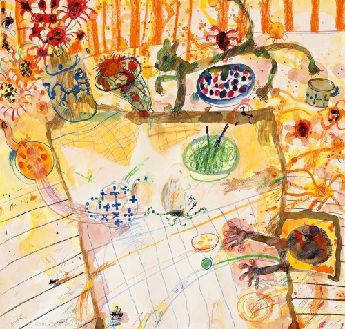 Kitchen Influenced by Flowers tells the story of a simple lunch but takes on an inspired urgency as we see every aspect of the activity at once. It is as though the entire event occurred simultaneously. The application of the watercolour in particular takes on the feel of cooking stains as they spill their way around the surface as Olsen’s playful repertoire of mark making adds to the jovial richness of the work.