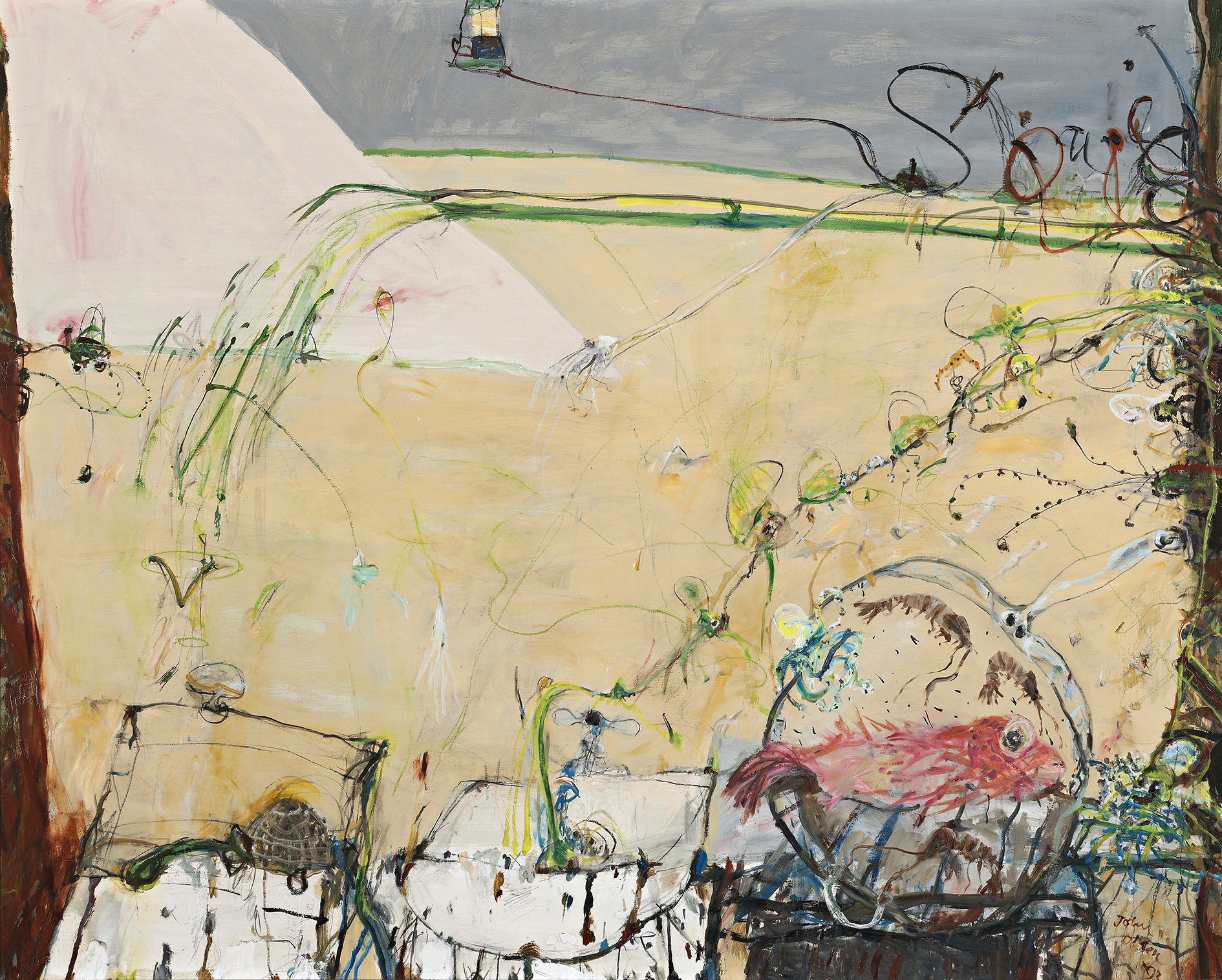 Olsen infuses his paintings with a life beyond the literal. They do not simply present an event as a static image, but as a rollicking yarn which unravels across the painting’s surface in great detail. Olsen’s Kitchen Story, 1993, is a cacophony of activity, in which the artist’s characteristic repertoire of marks are present in this celebratory painting. The lower right quarter of the painting for example clearly depicts the main ingredients; the luscious red fish provides a burst of high colour and scale which activates the entire composition. The fish, prawns and frying pan allow Olsen to flex his ability as a draughtsman as his wristy calligraphic brush marks find a delicate balance between illustration and expression.