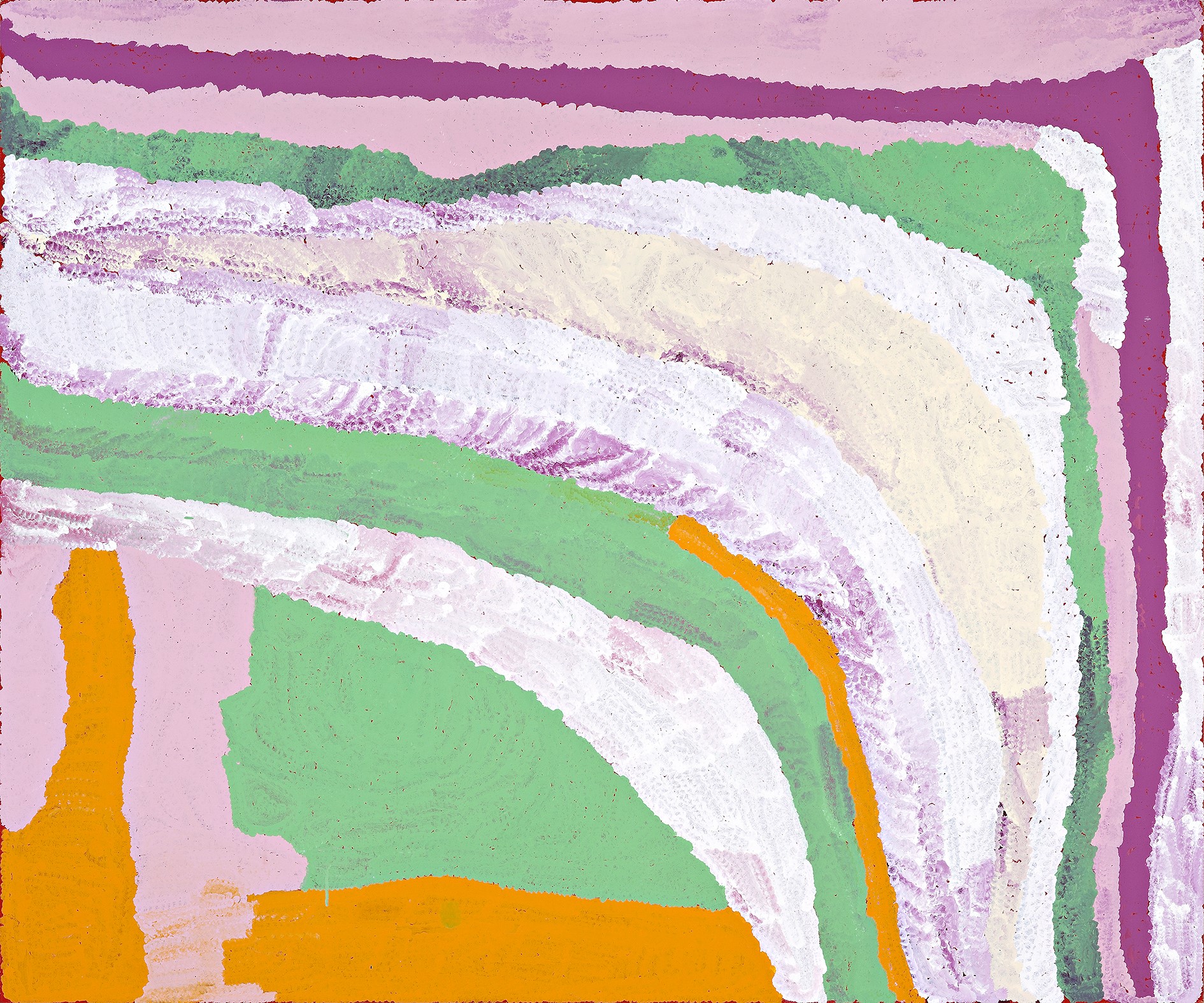 This painting is accompanied by a certificate of authenticity from Short Street Gallery that states: ‘Lydia says, “this is a well made of wood, whiteman, he put him on that Kulampurru jila (living water). This is my country, Mangala country. I be walking, I be big girl hunting dog, pussycat. My brothers and grandmother we see that well. Easy clean drinking water there.”’