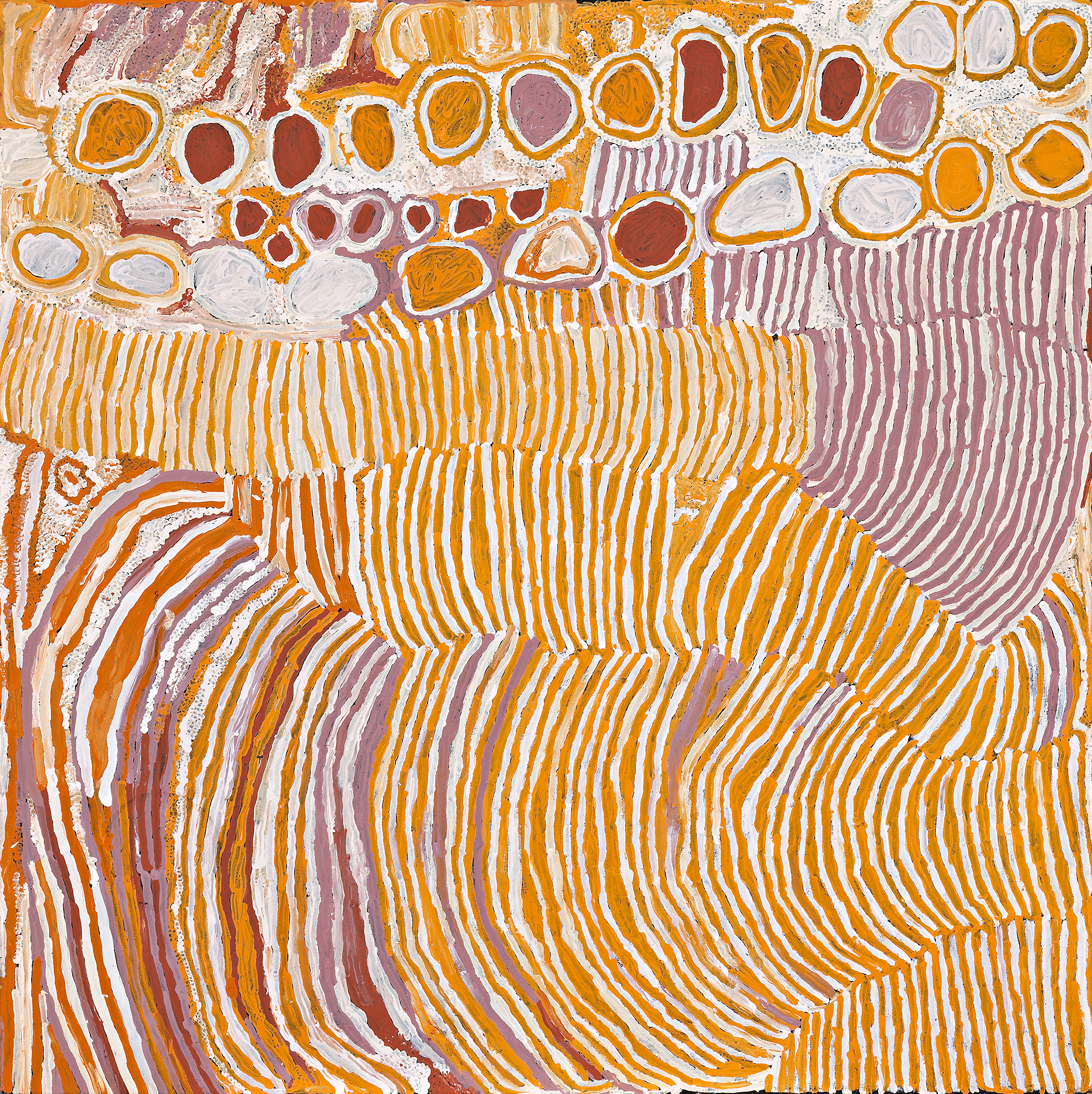 In Kungka Kutjarra (Two Women), 2000, Makinti Napanangka combines graphic motifs that dominated her earlier paintings–series of outlined circular forms, here denoting rockholes – with the bands of parallel arcs that became the hallmark of her later work. The rockholes were formed by Kungka Kutjarra, two ancestral women, at a site south of Lake MacDonald while digging for Kuningka, the Western Quoll. The bands represent the strands of spun hair string that make up the nyimparra or skirts worn by women in ceremony. The tactility of the paint in this picture suggests the practice of drawing in the sand to a narrative accompaniment, and the rhythms of the bands of arcs echo the sway of the skirts as women dance.