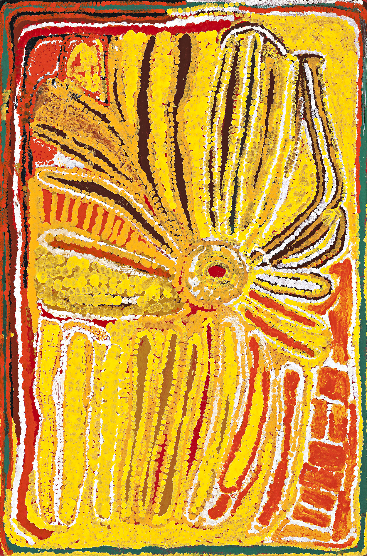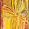 This work is accompanied by a certificate of authenticity from Warlayirti Artists, Balgo Hills that states: ‘Eubena is one of the true desert people as she was born in the desert and wandered with her family as they lived the hunter gatherer lifestyle. She was told many stories and myths from the “Tjukurrpa” (Dreamtime) and in this painting she has shown her country with its hills and creeks. Bush tucker is also depicted. We see a number of women hitting their heads in memory of a recently deceased friend. This is a ceremonial painting.’