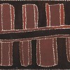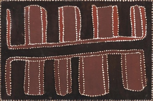 Thomas used his deeply personal vision to redefine the pictorial conventions of the region and Kununurra Bridge, where an aerial planar view depicts the road bridge as flattened country, typifies the distinctive characteristics of his painting. However, in this image the curvilinear lines found in much of his work give way to a more angular composition, reflecting the man-made character of building and construction. Painted on the textured side of a sheet of Masonite with a black charcoal ground, the palette is derived from the deep brown and red ochre of the Kimberley landscape.