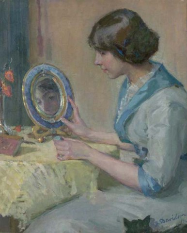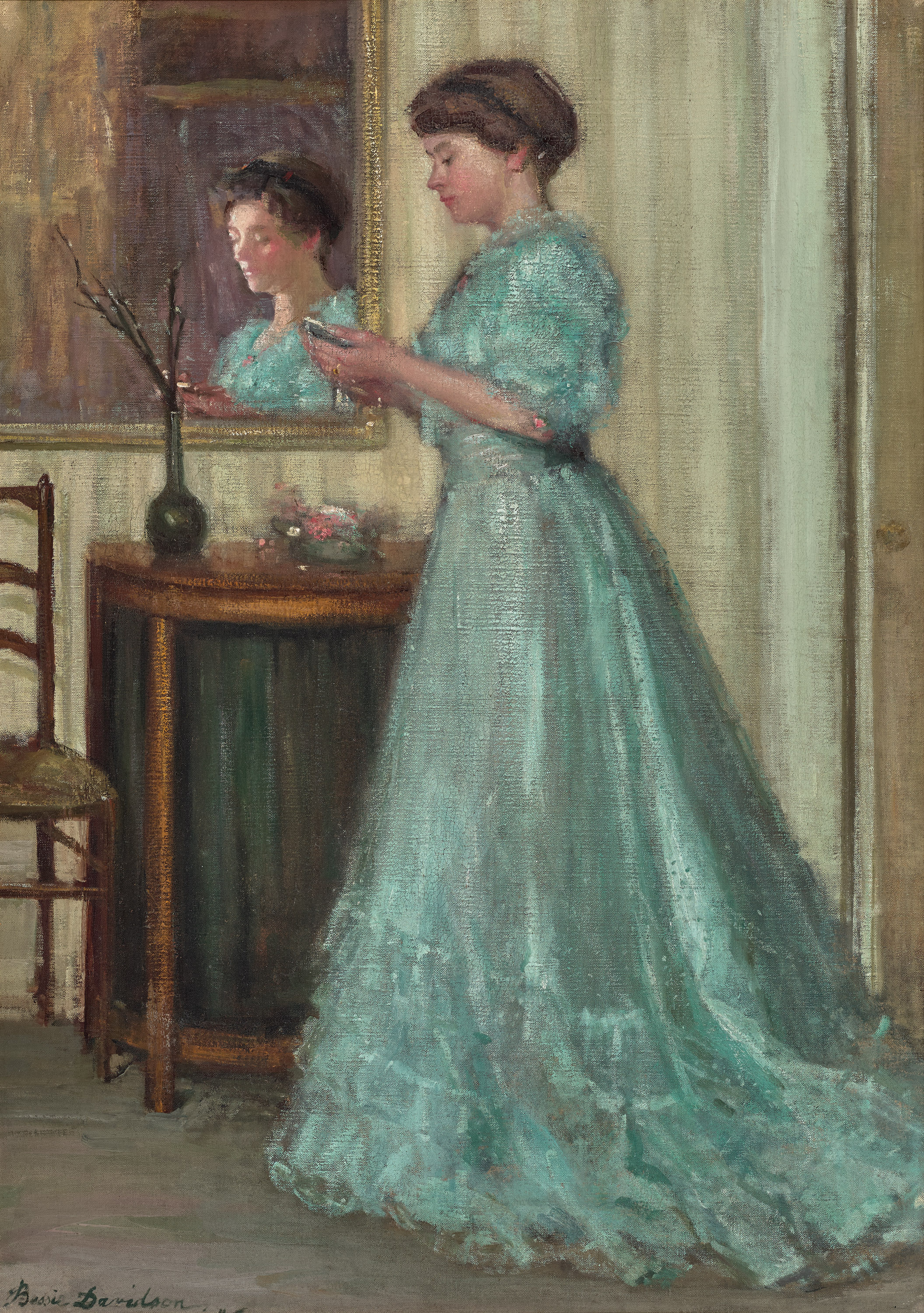 An important work dating from her early life in Paris, La Robe Bleue captures exquisitely Davidson’s predilection for the subject of a woman alone in a domestic space, and the variety of states – loneliness, introversion, or pleasured independence – that might imply. In the present case, the figure appears in contemplation of some treasured possession (perhaps a photograph in a frame) and the mood is contented, with her elegant costume and surrounds conveying an air of genteel and cultured respectability. As with her depictions of women at leisure elsewhere, the figure is passive and does not meet our gaze; rather the viewer sneaks a furtive glimpse of her in a private moment of reflection or nostalgia.