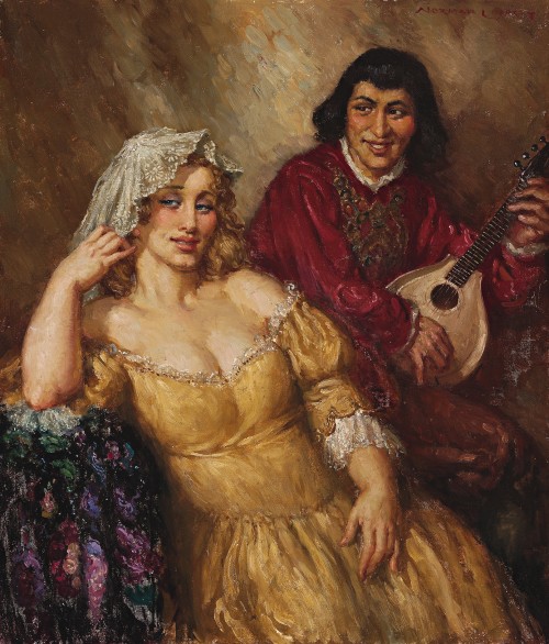 A romantic courting subject, set in medieval times with serenading troubadour and lute, Lady and Troubadour was painted around the time Norman Lindsay completed his extraordinary, large and ambitious Don Juan 1935 (The University of Melbourne Art Collection, a gift of the artist, 1969).
