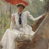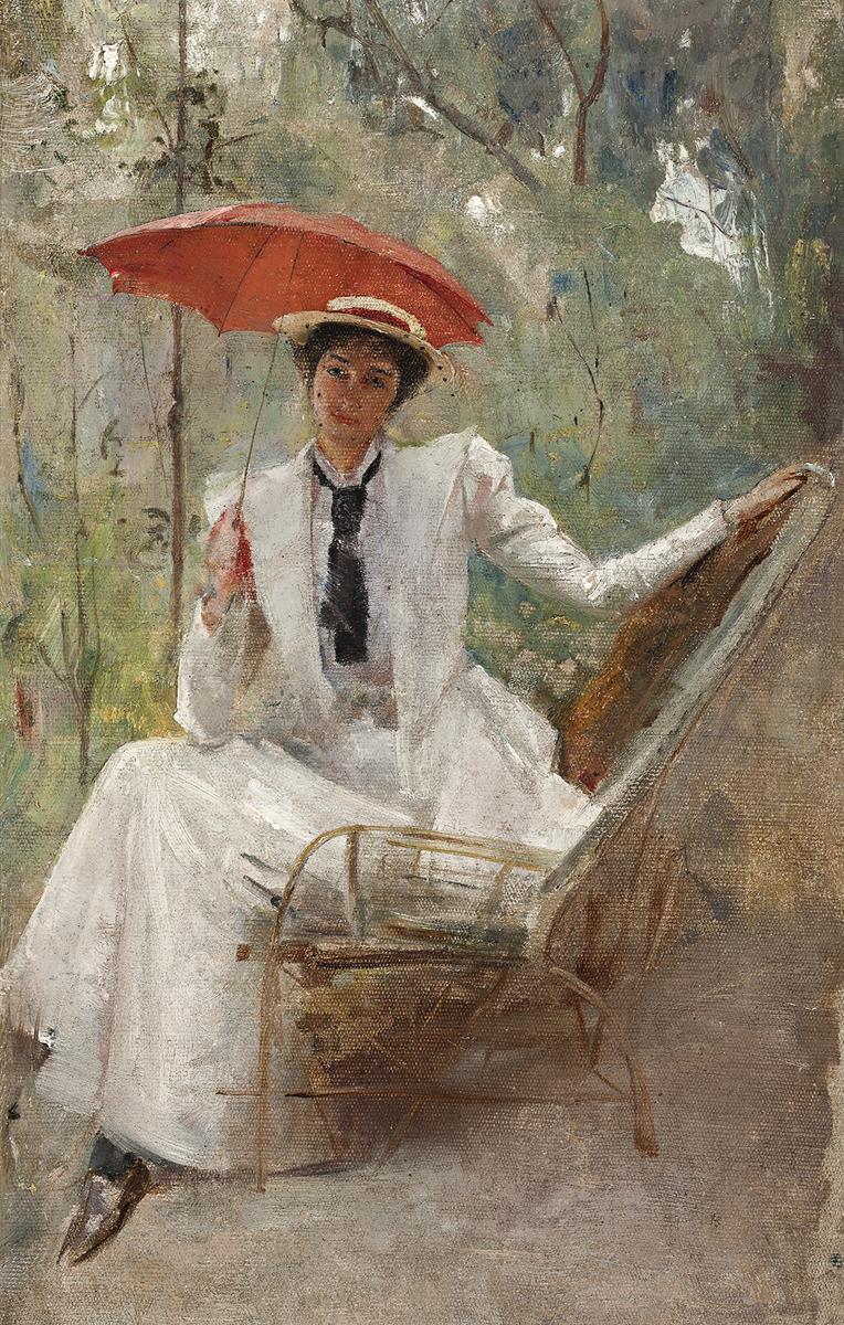 The immediate appeal of Tom Roberts’ Lady with a Parasol, c.1889 comes from its masterly handling, subject and colour. Painted en plein air, the fresh, lively atmosphere is enhanced by the combined look of self-assurance and informality of pose, the slight angle of the head adding a quizzical touch as sunlight plays sensuously across form and fabric. It also provides a strong fashion statement in both dress – loose necktie and the jacket’s wide lapels – and social commentary in the growing independence of women. Inviting of appearance and modishly dressed in white (better suited to the Australian climate), touches of pure black in tie and shoes afford further enlivening contrasts. This is extended in the cropped left edge of the composition, suggesting modernist influences of photography, and spontaneity of realisation characterising the best of French Impressionism. The influence of James McNeil Whistler is present in the captivating elegance and simplicity of presentation, echoes of aestheticism and Japanese art. Whistler’s own painterly journeys in white include the magnificent Symphony in White, No. 1: The White Girl, 1862 in the collection of the National Gallery of Art, Washington. In Lady with a Parasol Roberts introduced a subtle elongation, giving a gentle sophistication to the informality of his figure, the casual moment captured with an engaging vivacity of realisation. The most striking accent is, of course, the red – of parasol, hatband, and touches on the right hand and nearby bush. They not only provide bold contrasts against the blue-green of the background, but also offset the brilliance of the white accents on sleeve, shoulder, arm and cuff.
