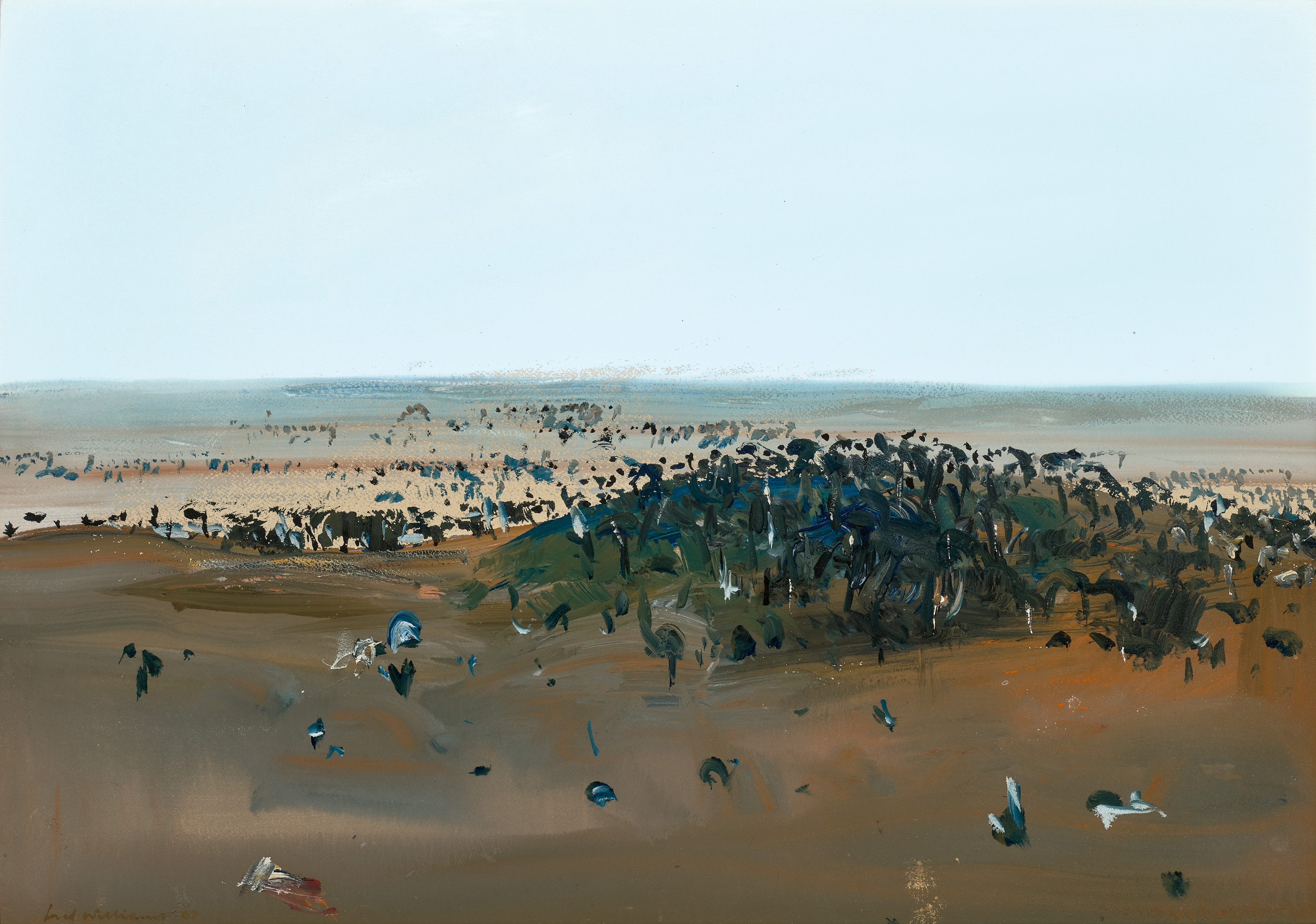 From this crucible of formal innovation comes Landscape, 1967. Like many other gouaches and paintings from this period, it has a tripartite division, concentrating much of his gestural information in a central band across the paper – the rolling crest of a hill with a crown of trees protruding from the horizon, and pale blue sky beyond. Williams worked in various media throughout his career – the technical possibilities and creative innovations of one invariably influencing his work in another. A quick-drying medium composed of watercolour mixed with white pigment (which renders it opaque), gouache was his preferred medium for painting outdoors during this time. Yet as this example demonstrates brilliantly, in addition to its convenience and ease of use, in Williams’ hands, gouache also offered something of the richness of oil paint in terms of the pictorial possibilities and textural manipulation it allowed.