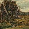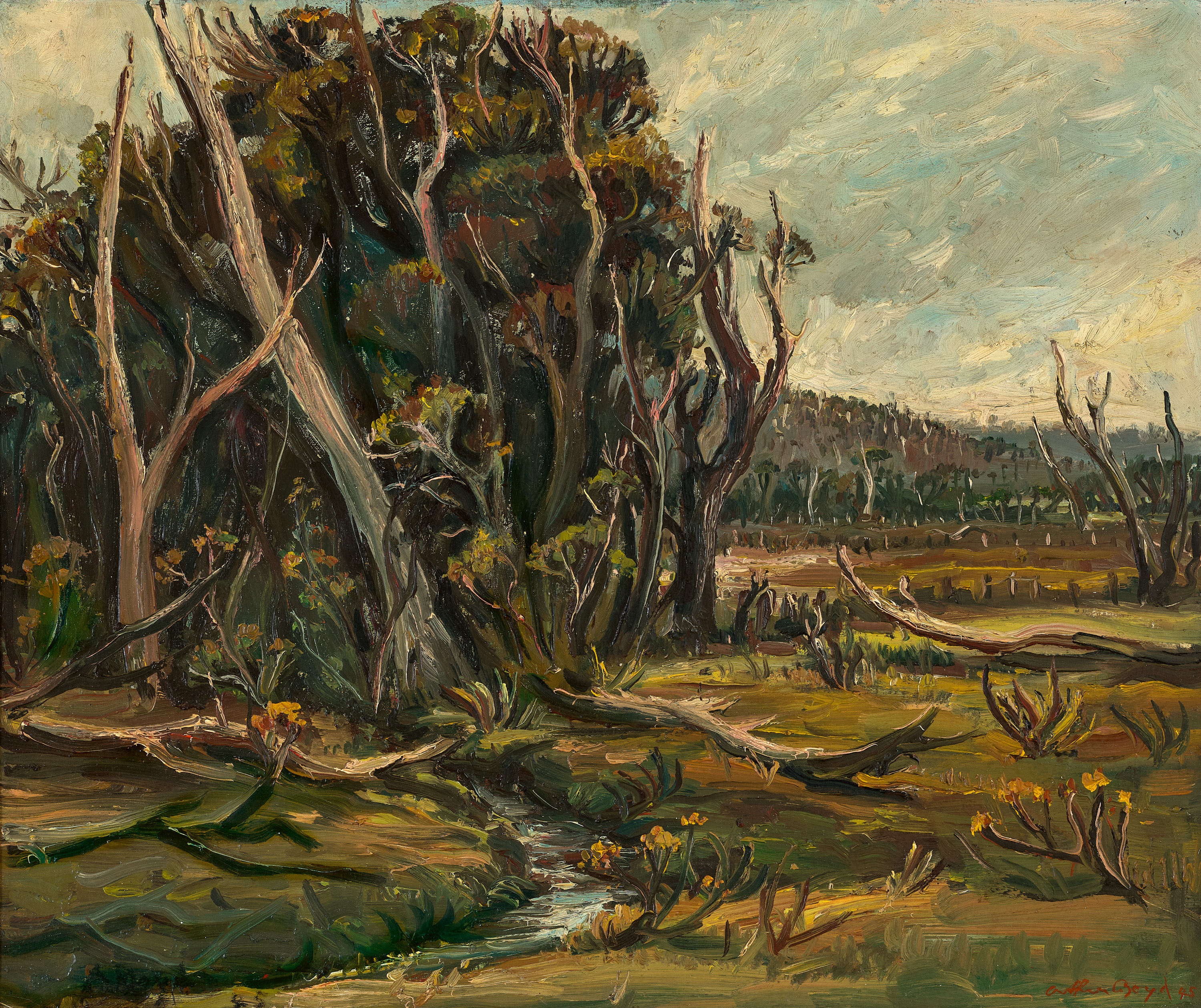 In the mid-1930s, a young Arthur Boyd had his first encounter with the town of Bacchus Marsh, located in a fertile valley on the border of the traditional lands of the Woiwurrung and Wathaurong peoples in Victoria. Despite the bucolic setting, the encounter was not pleasant. Scouting locations for scenes to paint, Boyd was caught in a downpour and took shelter under the awning of a local shop. Spying the bedraggled, long-haired teenager, the local policeman decided he looked like a criminally inclined delinquent, and ‘before any harm could come to Bacchus Marsh, Arthur was run out of town.’1 It would be easy therefore to consider this subsequent painting, Landscape (Bacchus Marsh), 1943, depicting a twisted and foreboding snarl of trees, as a riposte to the town but it is far more complex and important than that. It is instead recognised as a pivotal work, one of the artist’s key paintings done in response to the anguish of World War II.