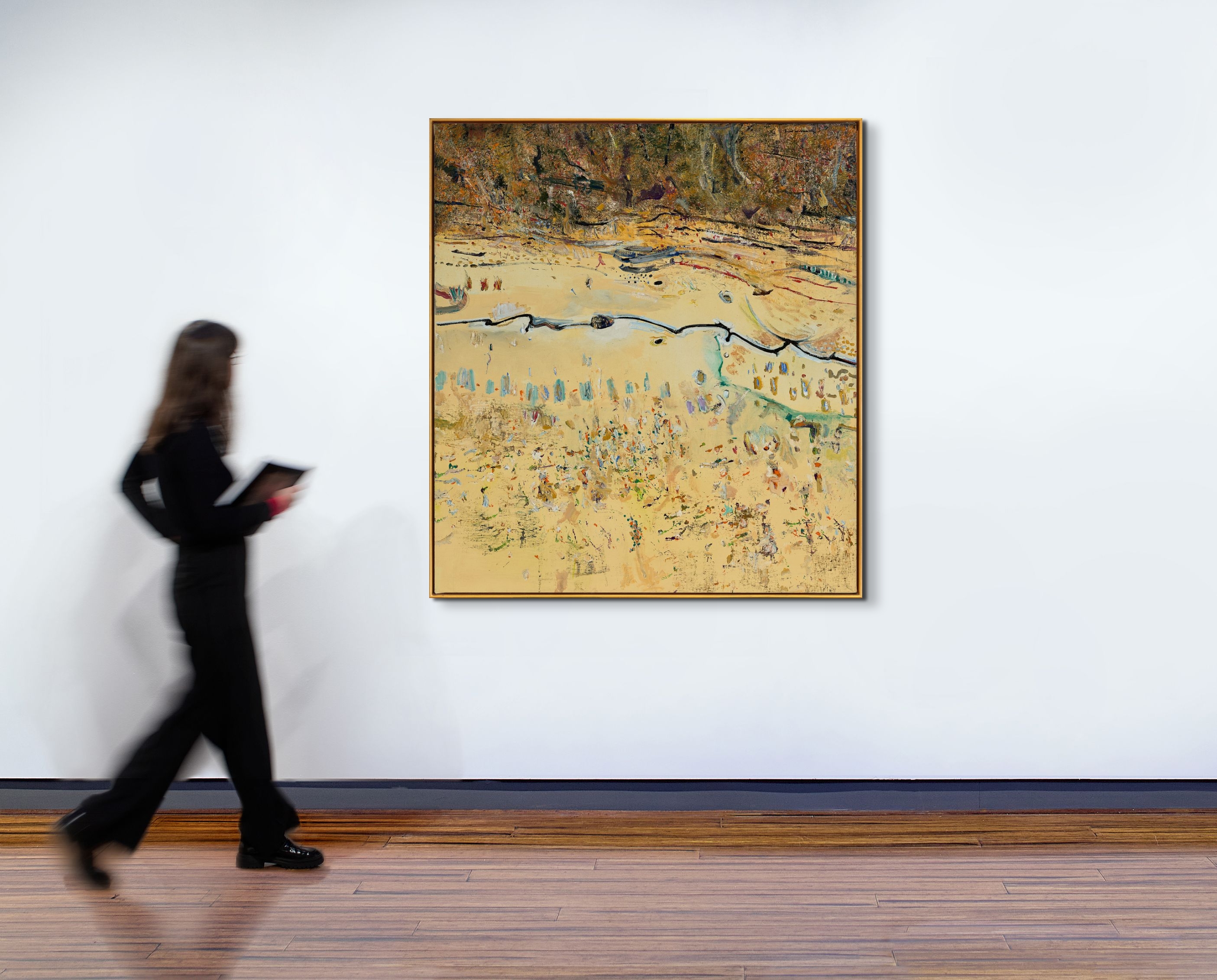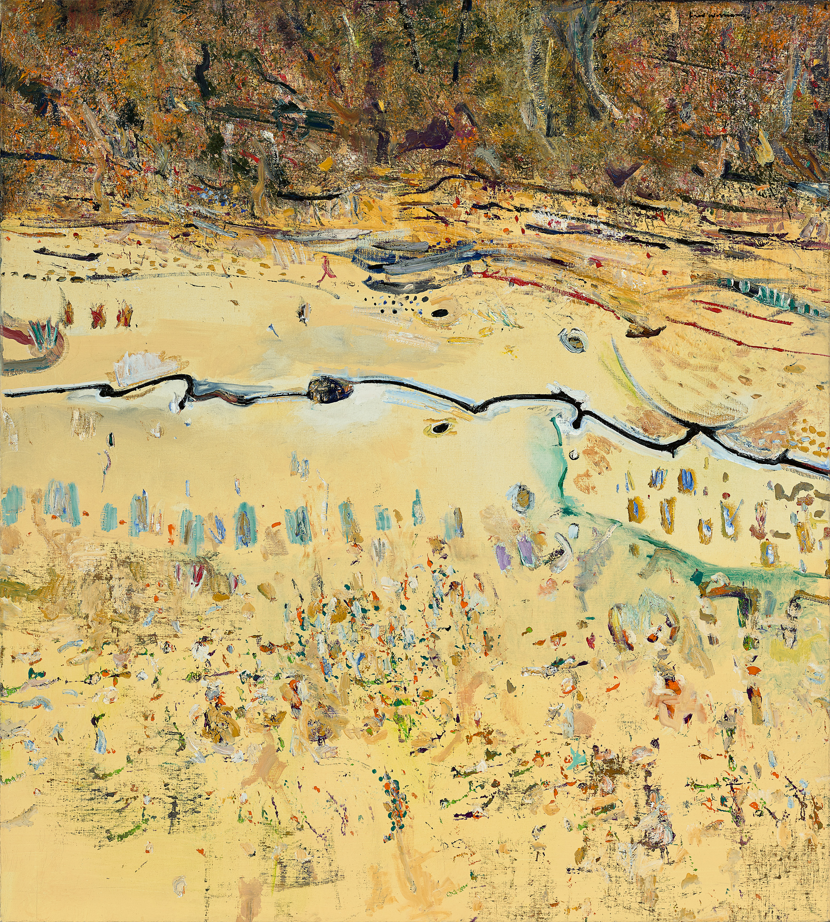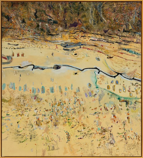 Landscape with Creek Bed presents a veritable catalogue of painterly forms which are applied on top of a pale sandy ground. A black line defines the irregular path of the creek, dancing across the canvas and establishing a syncopated pictorial rhythm that reverberates throughout the painting. Thick vegetation across the top is described by a dense, richly textured band of loose, gestural brushstrokes interspersed with areas of paint that have been dabbed onto the canvas by splayed and flattened bristles of the brush. The composition opens up on either side of the creek with sparsely painted lines and characteristic dots, dashes and daubs defining the changing terrain and other observed features of the view. The bottom section of the painting is classic Williams – a series of delicate and yet energetic marks which, in their varied technique and colour, convincingly depict an open, sparsely vegetated landscape. His delight in the subject is palpable, as is the confidence of his gesture and mastery of his medium. Williams was a consummate colourist and while the first impression of this painting is one of muted landscape tones, closer prolonged inspection reveals glimpses of brilliant colour – green, mauve and rich reds – that are such a distinctive feature of his work, and indeed, so typical of the experience of being in the Australian bush.