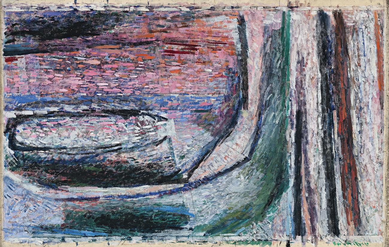 The Woronora River is located on the southern outskirts of Sydney and it is probable this painting started as a sketch done whilst Miller was staying with his friend, the artist Carl Plate, who had a cottage there.3 Starting with the drawing of the boat and trees running to the water’s edge, Miller gradually pared the motif back to its essential rhythms, lines and curves, where ‘natural appearances are never entirely eradicated, being held as it were in flight between intricate, interpenetrating grids … allegories of a universe in which form and colour are continuously created and destroyed by energy and light’.4 Miller himself described his finished paintings as depicting a reality ‘made of cadences, rhythms, materials – all that science ignores’.5