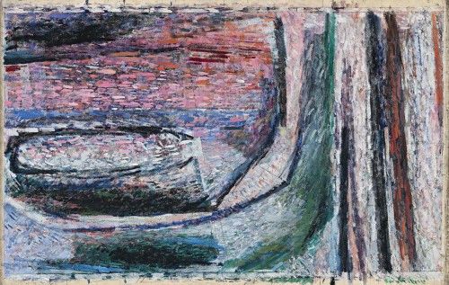 When Godfrey Miller died in 1964 in his run-down cottage in the inner-Sydney suburb of Paddington, his neighbours considered him a lonely recluse. They were subsequently amazed when notable members of the artworld started descending on the site, securing it from outsiders. For what they suspected, and ultimately found to be true, was that the shabby exterior hid a treasure trove within of paintings, drawings and sculptures by one of Australia’s truly individualistic abstract artists. Miller hated to part with his artworks and indeed, only held his first solo exhibition in 1957 when he was in his mid-sixties in spite of having first trained as an artist in New Zealand before World War One. Landscape, Woronora, 1953 – 55, comes from that hidden hoard and like its companions, was painted over a number of years as the artist ‘set himself to capture a feeling for the essence of things in the flux of changing experiences; to find a pictorial technique capable of celebrating both permanence and change at the same time’.1
