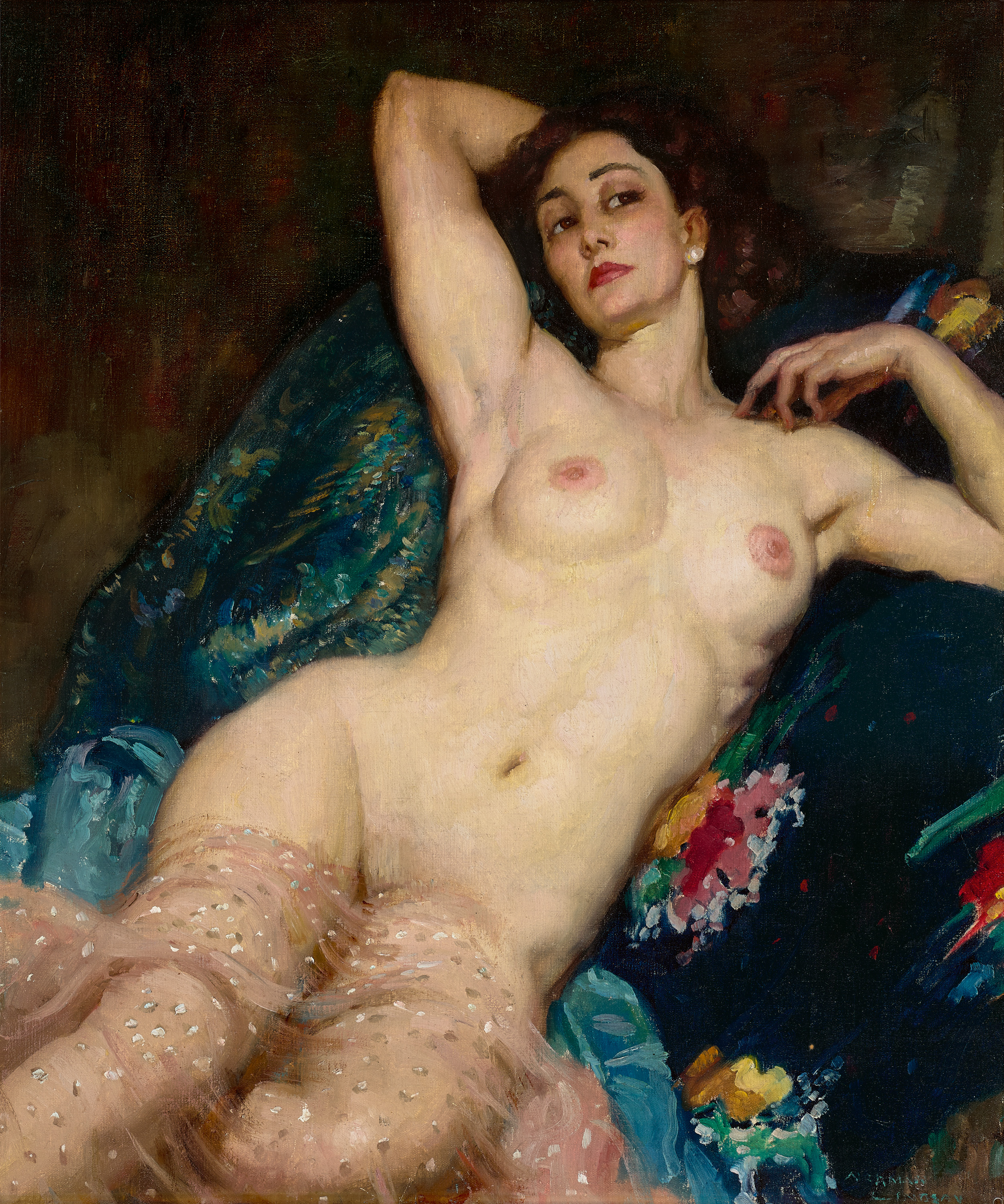 Famed for his watercolours and black-and-white art, Norman Lindsay was a relative latecomer to oil paint and only began using it seriously in the mid-1930s. It coincided with a separation from his wife and long-time muse Rose, with Lindsay moving into a new studio in Bridge Street, Sydney, whilst his estranged wife stayed at Springwood, the family home at Faulconbridge in the Blue Mountains. The next years became an incredibly productive period for Lindsay who began attracting a number of new models including those he spotted when attending shows in Sydney’s thriving music halls. As he commented later in 1964, ‘I paid well, I treated my models well, and they liked posing for me. They liked me too.’1 This must have been true for his biographer Lin Bloomfield estimates that between 1930 and 1940, Lindsay used the astounding number of 140 different models, paying them up to ten shillings for a single long sitting. Langour, 1934, is one of the first paintings painted at Bridge Street and although this model has not been firmly identified, she bears a strong resemblance to Gloria Scalis who posed for a clutch of works around the time, such as Repose, c.1933; Lin Bloomfield, however, sees an equal likeness to a model named Cécile who posed for an eponymously titled painting, also from c.1933.