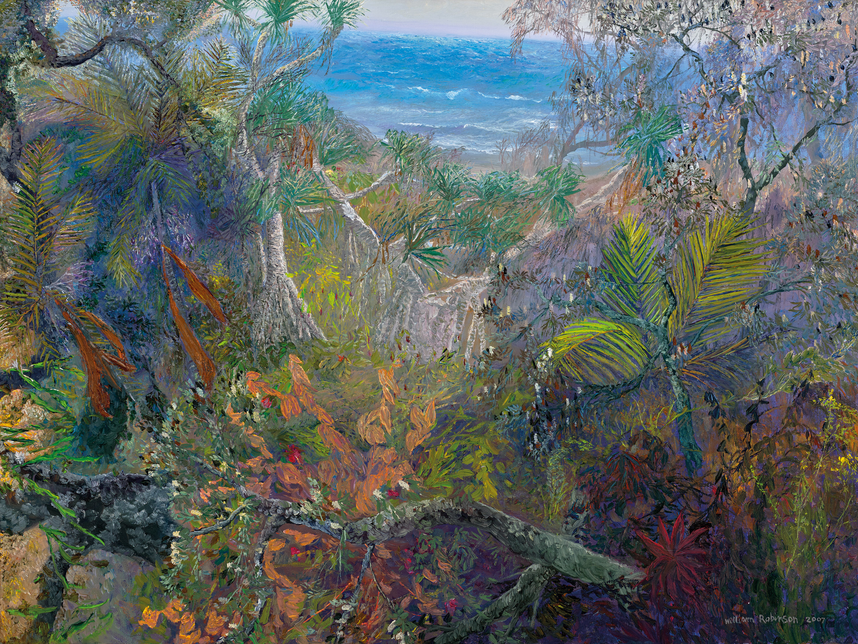 The current example is from a group of works painted around the Byron Bay area. The Robinsons had moved there from their Springbrook property and the views of the ocean provided the artist with fresh material. Where Robinson’s Kingscliff coastal works created in the mid-1990s had focused on the local beach activities, this later series featured the sea as viewed or glimpsed in the distance through dense forests. In this manner, Robinson brings together two important phases of his work.