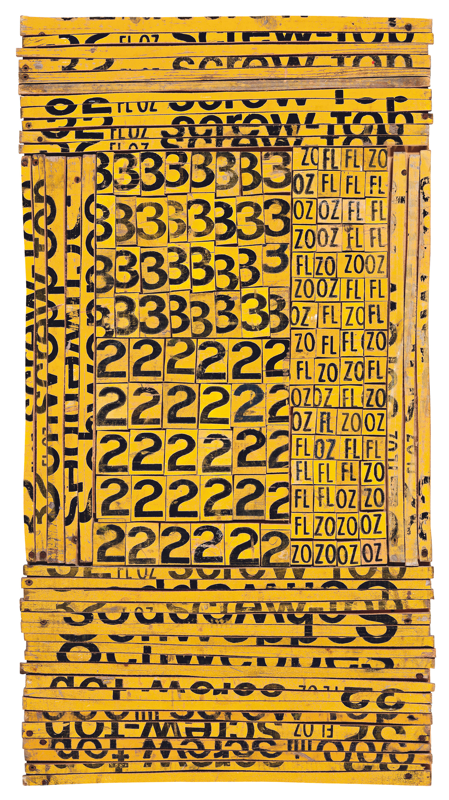 Of all Rosalie Gascoigne's achievements, undoubtedly the most striking and widely celebrated are her assemblages such as Ledger, 1992 which incorporate the shimmering black and gold text of weathered wooden Schweppes crates. Having eschewed the use of iconography, Gascoigne thus transforms text into texture – a wordplay of which she was no doubt aware – to create a powerful sense of landscape and light. With their rhythmic pattern composed of words and letters, such works have not surprisingly been described as 'stammering concrete poems’1, a perceptive analogy, especially given the artist's predilection for poetry from Shakespeare to Plath. Notwithstanding, Gascoigne stresses that the flickering word fragments, though carefully arranged, are not intended to be read literally: 'Placement of letters is important, but it's not a matter of reading the text – it's a matter of getting a visually pleasing result.’2