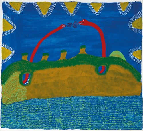 Capturing the saltwater area extending from the coast of the Gulf of Carpentaria along the Limmen Bight River to the weather-worn rocky outcrops known as the ‘Four Arches’, Limmen Bight Country, c.1990 offers a stunning example of Riley’s heroic landscapes. Pivotal to the composition is Garimala, the mythological Taipan who, according to the ancestral dreaming, created the Four Arches – an area regarded as ‘…the centre of the earth, where all things start and finish’3 – and lives in the waterhole nearby. Here the mythological serpent is transformed into Bulukbun – the angry, fire-breathing ‘serpent-dragon’ – and envisaged in duplicate, rising above the Four Arches depicted in ochre with vegetation atop, while the cobalt blue sky beyond is framed by yellow chevrons, a motif derived from Riley’s Yidditja ritual body paint designs.