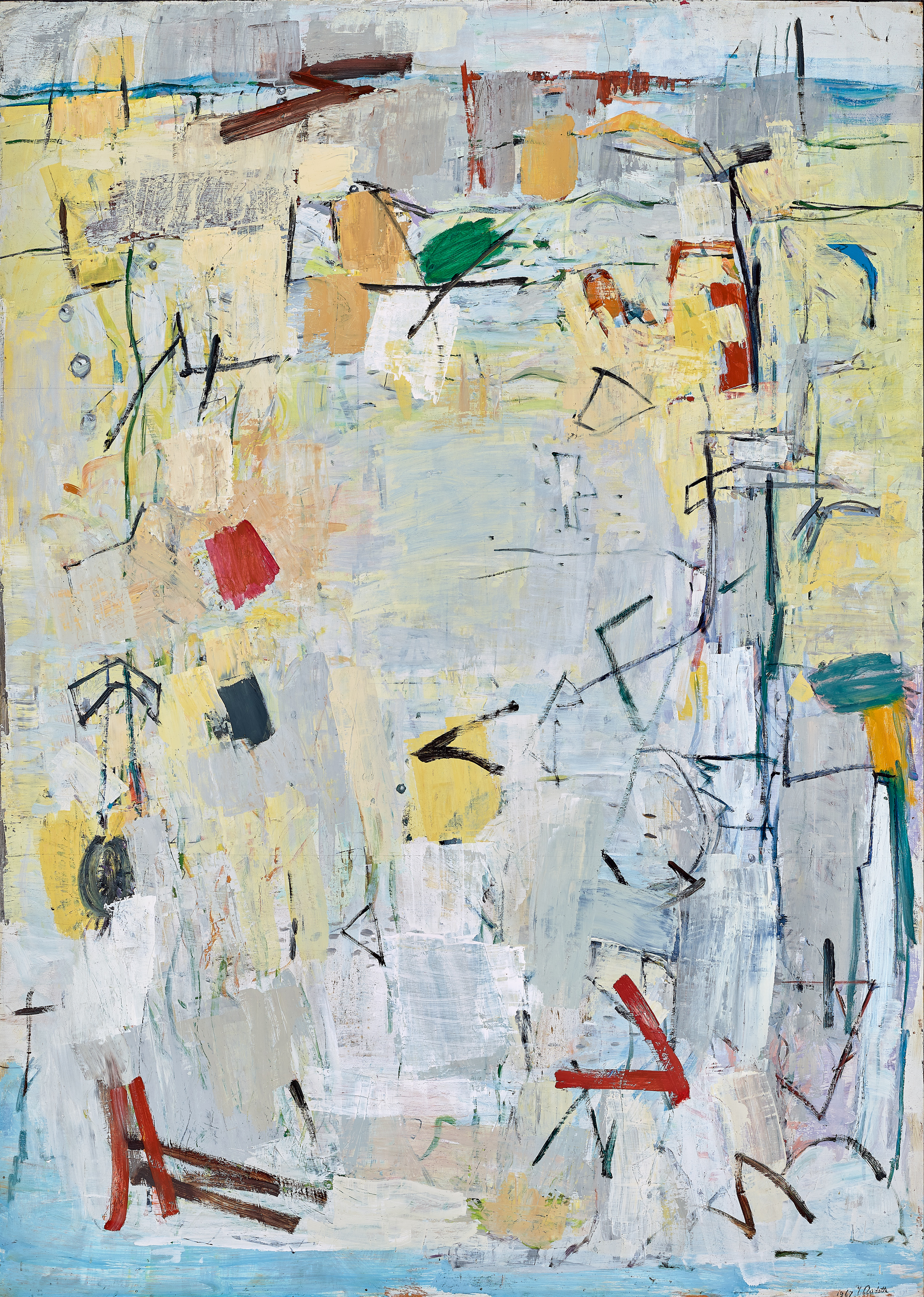 Begun in the early 1960s, Lines on the Grey Wall is typical of the compositions Audette produced around this time. Delicate yet dense, the image is built up through accretions of form and colour, intuitive lines, shapes and scribbles painted with the brush, alongside passages applied with a palette knife. While some marks are decisive, those seen through the broad patches of pale-coloured paint reveal the importance of layering and erasure within Audette’s technique. The influence of Asian art and calligraphy is also apparent. In addition to undertaking classes with a Zen painting teacher in New York, Audette was exposed to the work of numerous artists who incorporated calligraphic brushwork into their take on abstraction (Franz Kline, Mark Tobey and Pierre Alechinsky, for example), and she in turn did the same. The closely related (and similarly titled) painting, The Grey Wall with Lines, 1957 (Queensland Art Gallery and Gallery of Modern Art) was included in the Guggenheim Museum publication, The Third Mind: American Artists Contemplate Asia, 1860-1989, as an example of this influence and the significance of New York ‘as an international center for the forging and disseminating of Asian conceptions of abstraction.’5