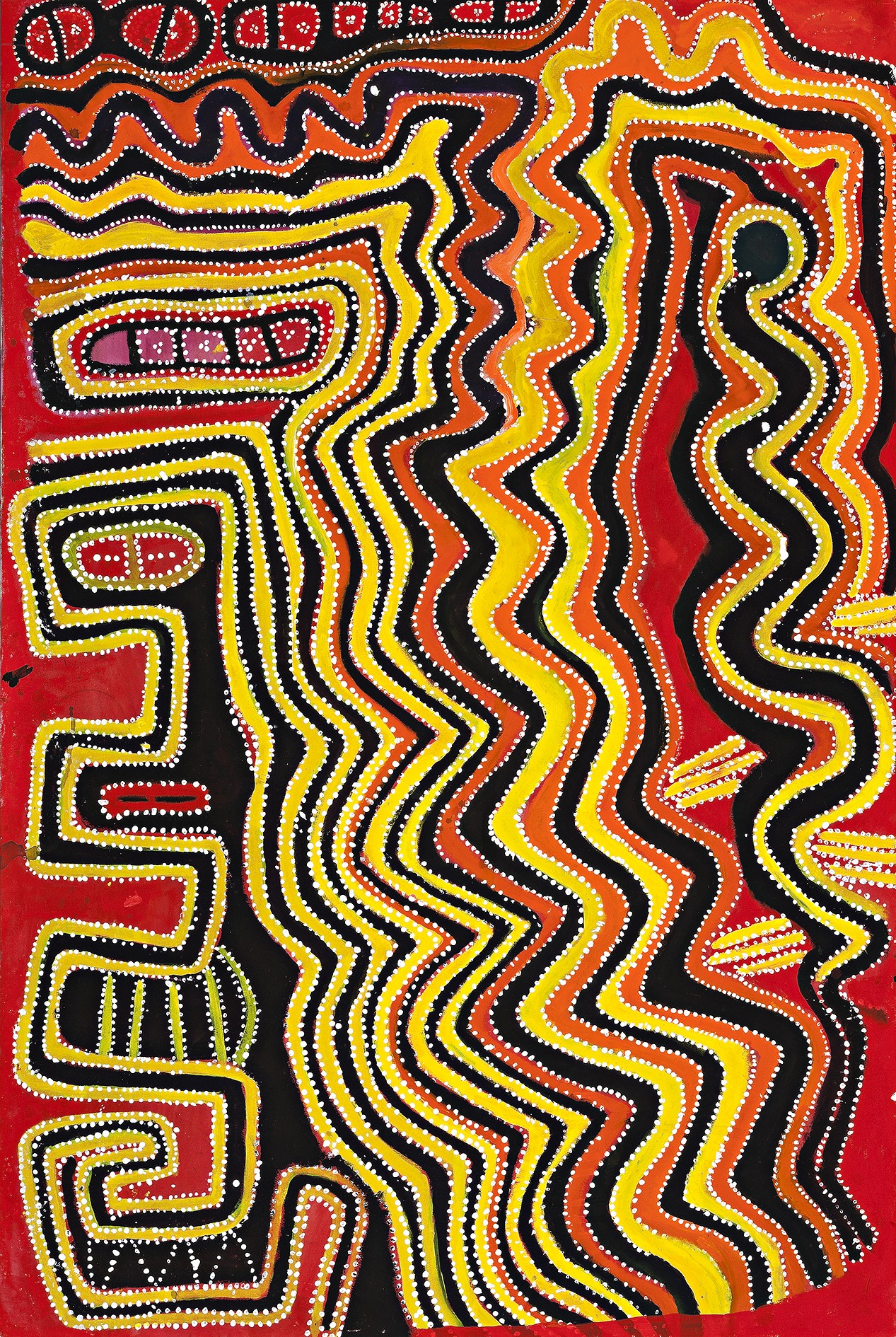 This work is accompanied by a certificate of authenticity from Mangkaja Arts, Fitzroy Crossing that states: ‘This place is called Lirriwarti. Wilupilya came to this place from Pajpara. He started fighting with another man, a Jangala. They speared themselves and they became lame. They were fighting over a woman, a Nuparula. She was promised to Wilupilya but he found that she had already had two children to this other man. He got wild and threw the children onto the ground. The children died and his wife stayed there. Wilupilya came back to the jila (permanent waterhole) here at Lirriwarti. This was his ngurra, his camp. He walked out from here.’