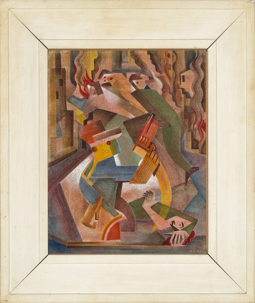 Frank Hinder’s Little man with a big gun (Mussolini), 1939, is a highly significant painting, one of only two known works by Australian artists that comment directly on the rise of European Fascism in the lead up to World War Two. The other is Peter Purves-Smith’s The Nazis, Nuremberg, 1938 (Queensland Art Gallery | Gallery of Modern Art) which was his direct response to the antisemitic horrors he witnessed in Europe. It is important to note that these two works were painted some years before the renowned Anti-Fascist Exhibition of 1942, organised by the Contemporary Art Society, and featuring the work of artists such as Noel Counihan, Sidney Nolan and Albert Tucker. By that stage, war had been declared and the justifiable alarm at the actions of Hitler and Mussolini had finally galvanised artists into action. Ironically, Hinder’s premonitionary painting was not included.
