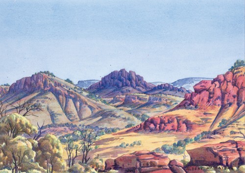 Albert Namatjira was a naturalist and a tonalist, whose patrilineal totemic connection to the country bordering and north of Glen Helen (Yalpalpe) and the Finke River (Lherre pirntea) formed the bedrock of his art and provided plural meanings for those viewers who could read them. Landforms as discrete entities held a certain fascination for the artist. Whether they are large mountains or monoliths on a smaller scale, they also hold spiritual meaning for the traditional owners and, as with many locations in central Australian, can be read as both ‘sights’ and ‘sites’.1