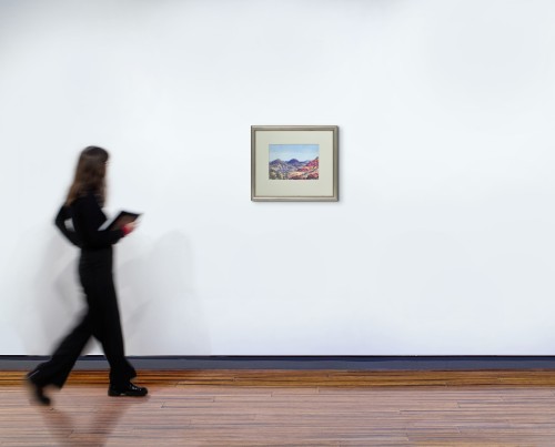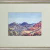 Painted in 1951, Looking West from Glen Helen observes the distant ranges far to the west of Glen Helen Gorge and appears atypical in that the viewpoint is not framed by a gum tree or rocky outcrop located in the foreground. Presenting a more open horizontal and expansive experience of the landscape, the viewpoint is nevertheless carefully controlled by the artist who directs the viewer to the distant peaks through the placement of intervening mountain slopes in the middle distance. Namatjira’s familiarity with his country is evident in these long distant views ‘where peaks and monoliths provide a rich range of possibilities and responses that arise from constantly re-engaging with the same subject.’2 They also resonate with important personal symbolism for the artist as statements of belonging – as coded expressions embodying the memory and knowledge of traditional ancestral sites, of his totemic places. Landscape artist Lloyd Rees acknowledged this duality when he observed ‘I find in his [Namatjira’s] work a marvelous sense of distance and of space. His eye can look so far away and seem to know what’s there’.3