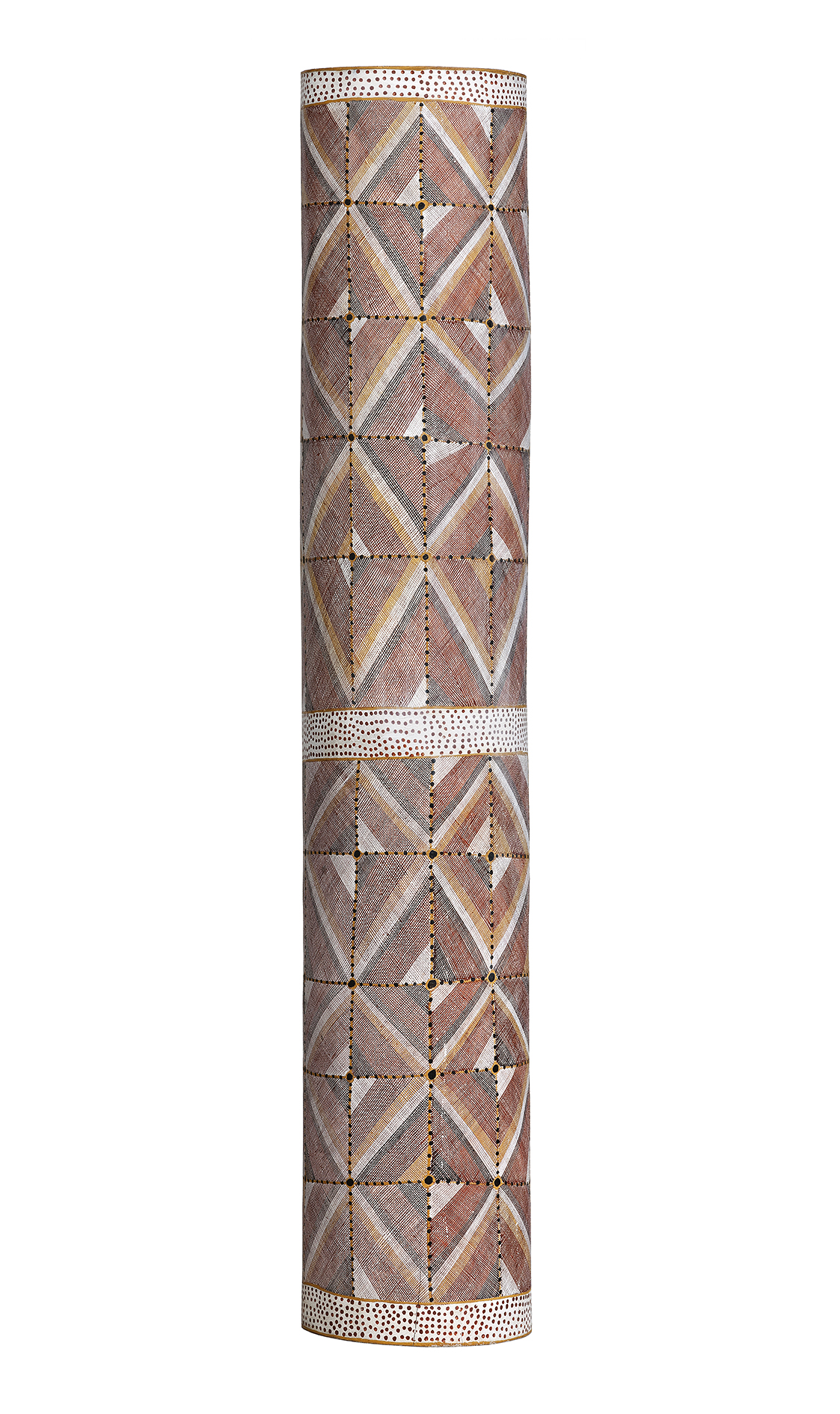 This work is accompanied by a certificate from Maningrida Arts & Culture which states: ‘The Lorrkon or bone pole coffin ceremony was the final ceremony in a sequence of mortuary rituals celebrated by the people of the Arnhem Land. This ceremony involves the placing of the deceased’s bones into a hollow log which was decorated with painted clan designs and ceremonially placed into the ground where it remained until it slowly decayed over many years. The log is made from a termite hollowed stringybark tree (Eucalyptus tetradonta) and is decorated with totemic emblems.’