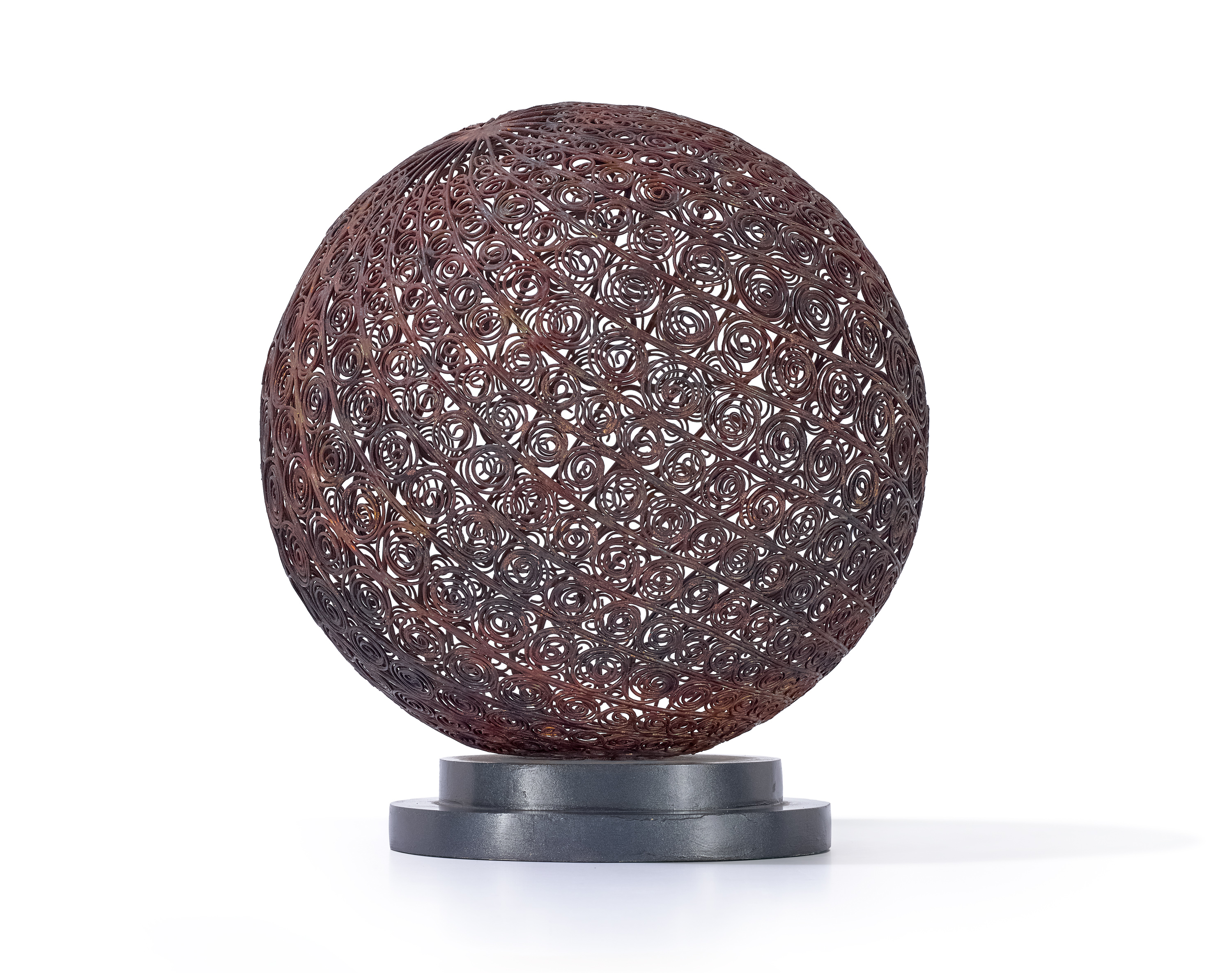 Furthermore, there is an undeniable reference to astronomical and cosmic macro phenomena, to forms that inhabit the great ocean of outer space. Specifically in Lunar, 2001, hundreds of connected spiralling tendril-like coils are presented in a hollow globe labyrinth leaning off-centre from its axis, thereby alluding to galactical musings. The surface has a remarkable depth as demarcated by the ellipsoid shape. Captivating shadows are cast by Oliver's objects, such as Lunar, and are an integral part of the work. Intricate patterns become projected and warped as the interplay between light and form is enlivened.