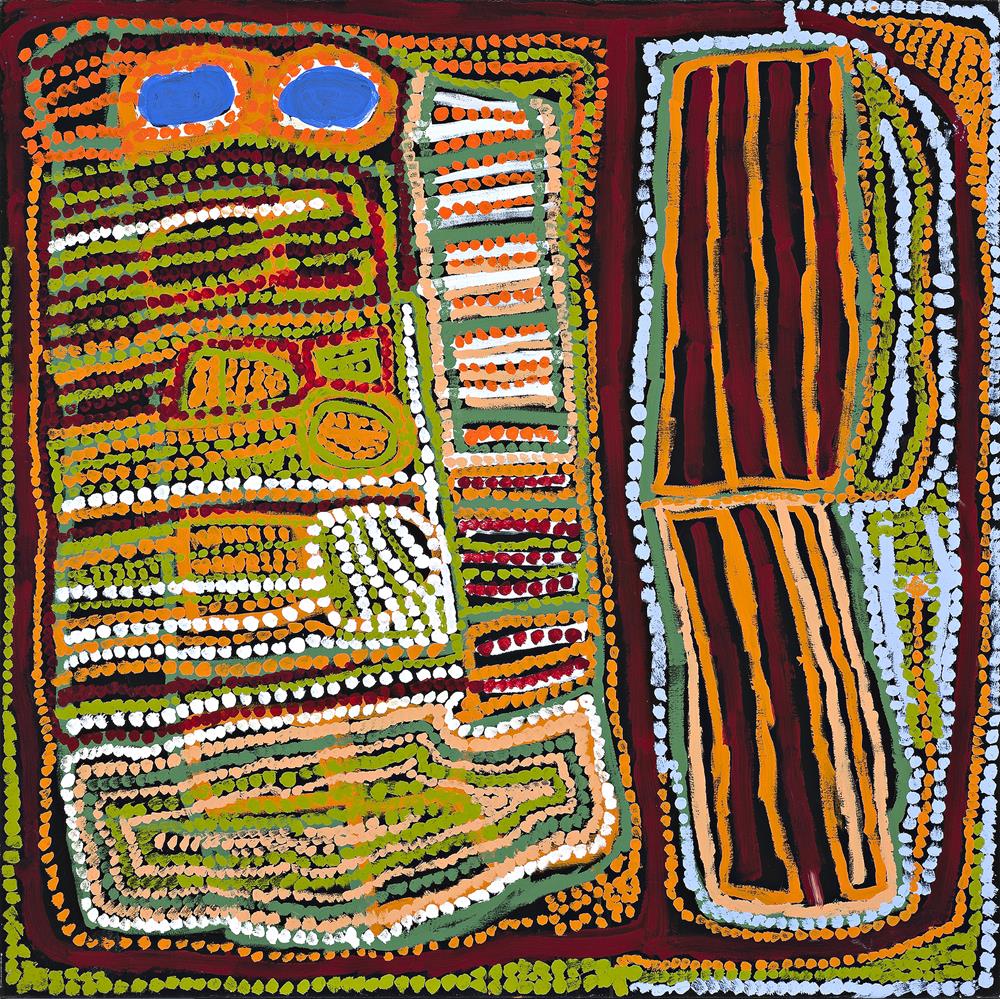 This painting is accompanied by a certificate of authenticity from Short Street Gallery that states: 'This is my country, Lungurang country. This is where I was born. I travelled around this place as a young woman walking through the sand dunes (tali) collecting mayi (bush food) with my daddy and two mummies. We hunted kuwi, and sat down there. We didn't have clothes then. There is mulga tree here. I had two brothers. It is this side (west side of Winpa in Western Australia.'