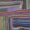 This painting is accompanied by a certificate of authenticity from Short Street Gallery that states: ‘This is my country, Lungarung country. It is on the Canning Stock Road in the Great Sandy Desert in Western Australia. This is where I was born. I travelled around this place as a young woman walking through the sand dunes (tali) collecting mayi (bush food) with my mother. We hunted kuwi (meat) and sat down there. We didn’t have clothes then. I had two brothers. It is this side (west side) of Winpa in Western Australia. It is desert country, proper one. It is my country. We get him bush onion (junta), near the jila [living water]. We sing for him and there is plenty there. We grind him up and cook him. He is good mungarri (bush tucker). There is a warla (mud flats) there.’