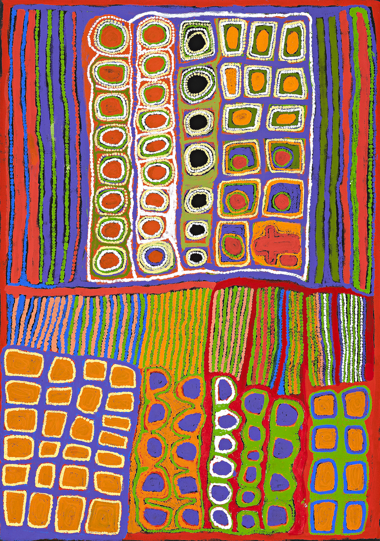 This painting is accompanied by a certificate of authenticity from Short Street Gallery that states: ‘Weaver Jack paints her traditional country south of Well 33 on the Canning Stock Route. When she first started to paint, the outlines of the country were laid bare on the canvas. Like a skeleton of the country, slowly she reclaimed this country dotting over it loosely at first. She said these were her people walking all around that country, collecting mayi (bush food) and hunting for kuwi (meat). Slowly the country merged with the people. It was then she started putting herself in the paintings and through her paintings, Weaver managed to reclaim her country.