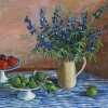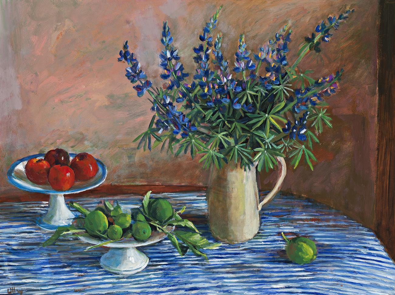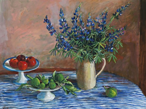 Lupins and Lemons features a bunch of effervescent blue lupins in a stoneware jug, balanced with deep red apples and ripening lemons upon a striped blue and white tablecloth. The composition is nonchalant, with a lemon casually resting beside its bowl as though it had toppled only moments before. However, this ambience conceals a carefully considered orchestration of space. Arranged and rearranged like props in a theatre set, the objects in Olley’s paintings were meticulously placed and, in time, became as acquainted to viewers as they were to the artist herself. The blue and white fruit bowl, jug and striped tablecloth are all recurring ‘characters’ on her stage, imbued with the stories and memories of her colourful life. The lush arrangement of lupins against the familiar pink backdrop of Olley’s home pay homage to her beloved European tradition of nature morte painting in a delicately constructed mise en scène. As Barry Pearce elucidates in the Art Gallery of New South Wales retrospective publication, there is more to Olley’s paintings than a mere still-life – we are invited into her personal domain: ’Darkness and light, fertility and decay, space and time, tragedy and comedy, solitude, camaraderie; all the things we know and imagine about life and humanity can be gathered at her table within the rooms of her world.’2
