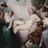 Scholars debate a Neoplatonic interpretation of Titian’s several paintings of Venus accompanied by a musical instrument and its player, of the contest between the senses of sight and hearing as better suited to the appreciation of love. In his painting The Lute Player, Lindsay declares the victory of sight through the lute laid aside for the veneration of visual beauty, the player in supplicant position and admiration. Lindsay’s model is Rose, his wife and his Venus, posing for the central figure as well as the two ladies on either side. Three photographs are known of Rose posing, and the National Gallery of Australia, Canberra, has the composition drawing.3