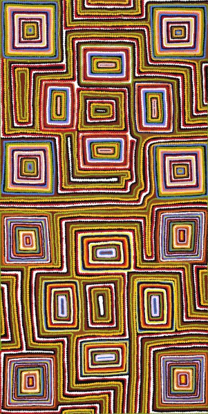 This painting is accompanied by a certificate of authenticity from Warlayirti Artists that states: ‘John has painted the story of Lurrnpa – the sacred Kingfisher as it made its Tjukurrpa (Dreamtime) journey through the Western Desert. This part of the story shows the journey of Lurrnpa from Talarpu to Ringer Soak, Blue Hills and finally onto Wirrimanu (Balgo Hills in Western Australia). The squares and lines in this painting depict the creeks, waterholes, hills and other features of the landscape that the Luurnpa created during its journey. The Luurnpa is a significant figure in the life of desert people and not only did it save people from drought and starvation, but also gave people Law, carried the Tingari men on part of their journey and created much of the country from Wirramanu to Luurnpa’s final resting place; Uluru.’