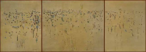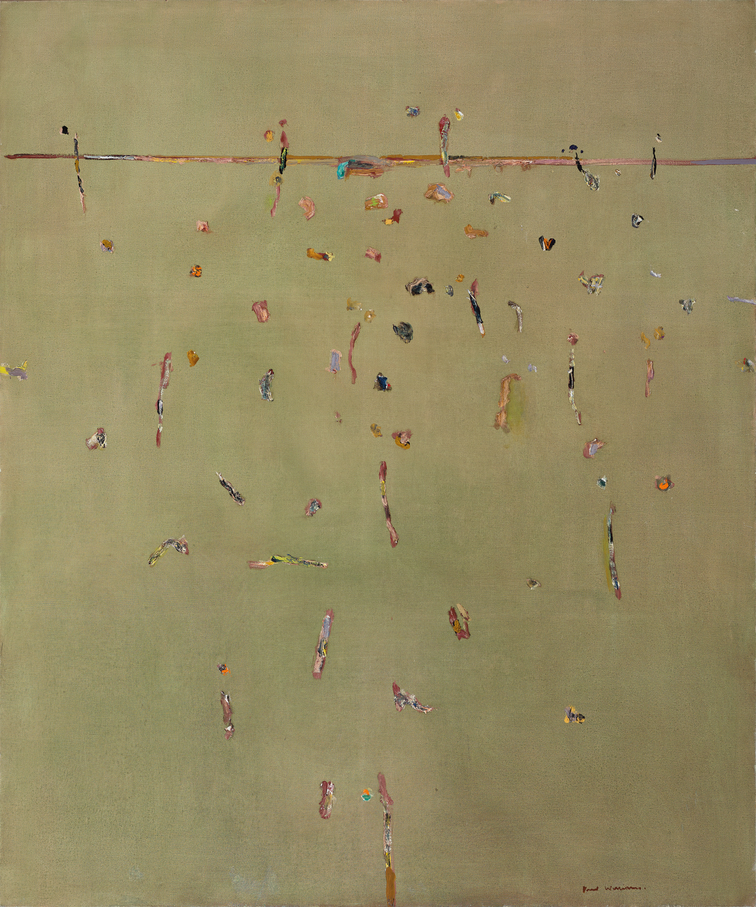Lysterfield Landscape is a masterwork where Williams’ is at his most withheld, subtle and sophisticated. Paintings such as Australian Landscape III, 1969 (Queensland Art Gallery ǀ Gallery of Modern Art) and Lysterfield triptych 1967 – 68 (National Gallery of Australia) employ a sequential format with white vertical screen-like separations across a horizontal canvas, where a calligraphic ensemble of painted gestures flit across the surface.