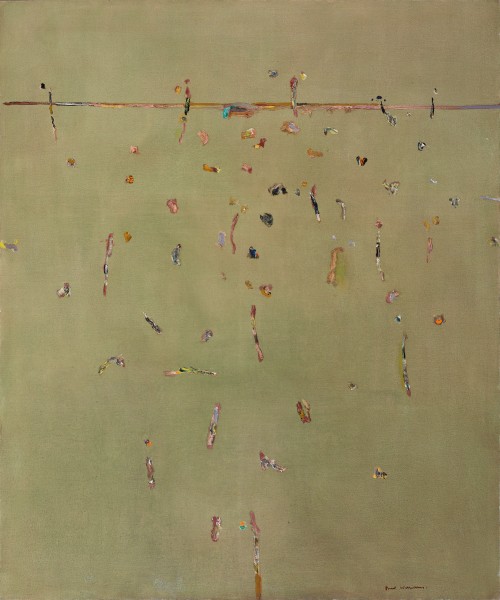 The vertical format and scale of Lysterfield Landscape, the sublimely worked surface, considered calligraphic marks and the distinctive high horizon line create both the sensation of the landscape as its source and a work acutely aware of painting’s history across cultures as well as contemporary trends.