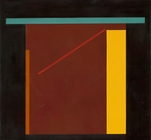 With what Patrick McCaughey described as ‘the sense and courage to go back to what he does best’2, returning to his ‘terra firma of New York abstraction’3, Johnson’s ‘Taylor Square’ paintings are late examples of high, Greenbergian formalism. They revel in the flat, inert materiality of synthetic polymer paint, enticingly matte and velvety – bearing the initial appearance of emotional neutrality through rectilinear shapes and bold unwavering lines. While these shapes within Madder, 1979, and other Taylor Square paintings echo the busy four-way intersection in the inner-city suburb of Darlinghurst, there is more to these paintings than a simple aerial diagram. Johnson’s aim was instead founded in the perceptual effects and tensions that can be created using the most basic of forms and colours, raw units of energy. Johnson’s linear and colour combinations cause effects of movement – superposition or receding depth. Fundamentally a colour-field painter, Johnson regarded these shapes as mere receptacles for delicately modulated colours, carefully and unevenly stained on unprimed canvas with borders not quite straight.