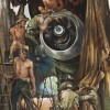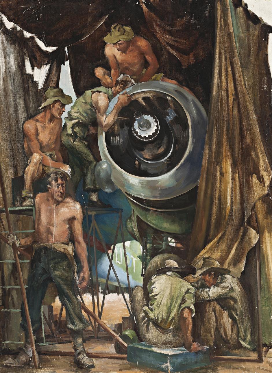 Maintenance Work on a Beaufighter depicts a scene on Noemfoor Island, which had become a key location for the maintenance and repair of Allied aircraft following fierce fighting in July and August 1944. Given the island was almost directly on the Equator, it is not surprising that the mechanics are shown in various states of undress. The extreme weather conditions also made it necessary for aircraft under repair to be protected at all times and, as the painting so vividly illustrates, temporary work shelters were constructed from any scrounged material found at the base.4 Alongside the Kittyhawk and the B-24 Liberator bomber, the Beaufighter was one of the RAAF’s key weapons, a powerful killing machine memorably described by pilots as being ‘two engines closely followed by an airplane.’ The Japanese however called it the ‘Whispering Death’ such was its devastating firepower. In Servicing a Beaufighter Aircraft, two teams focus on the repairs, whilst their standing companion is a ‘type’ rather than a direct portrait, reminiscent of the larrikin soldier memorably depicted on screen during the war by Australian actor Chips Rafferty.