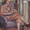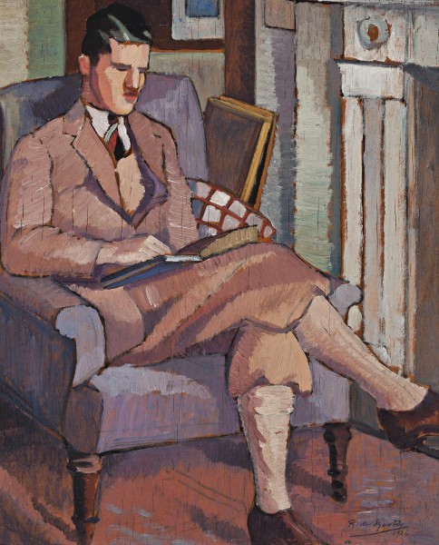 Apart from his name, the identity of the sitter is unknown but he could almost be a stand-in for the artist who was himself an avid wearer of the distinctive ‘plus fours’ outfit. The location is de Maistre’s studio, identifiable by the distinctive fireplace mantelpiece and the armchair, which was upholstered in a rich floral jacquard fabric. These elements feature in two other notable paintings by de Maistre, Studio, Burdekin House, 1928 (location unknown), and the vibrant At Burdekin House Studio, c.1928, formerly in the collection of John Young, the influential Director of Macquarie Galleries. Additional identification for the location is provided by two of the artist’s paintings neatly stacked to the left of Davis’ shoulder. There are many numbers of paintings featuring a person with a book and this subject has been interpreted as reflecting the rising status of reading amongst the middle classes.1 Similar examples amongst de Maistre’s modernist peers include Grace Cossington Smith’s The Reader, 1916 (Art Gallery of New South Wales, Sydney) which utilised her sister Diddy as the model; Roland Wakelin’s Man Reading, 1933 (Collection of John Wakelin); and Margaret Preston’s The Studio Window, 1906 (National Gallery of Australia, Canberra), depicting a woman reclining on a lounge reading a magazine.2