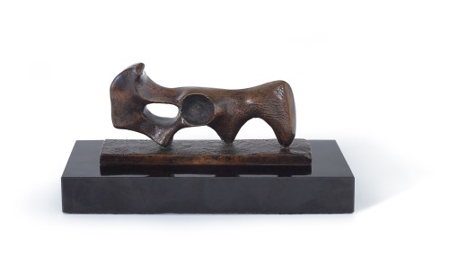 Maquette for Reclining Figure: Circle, 1983 is a small editioned bronze sculpture by Henry Moore, cast from an original plaster carving (LH902, plaster, now held in the Henry Moore Foundation), and later enlarged into another editioned bronze sculpture (LH903), although never into a monumental format. A quintessentially modern artist, Henry Moore created sculptures which rarely refer to their geographical environment, and can exist independently as small objects, to inhabit in private spaces as well as in grand, public ones.