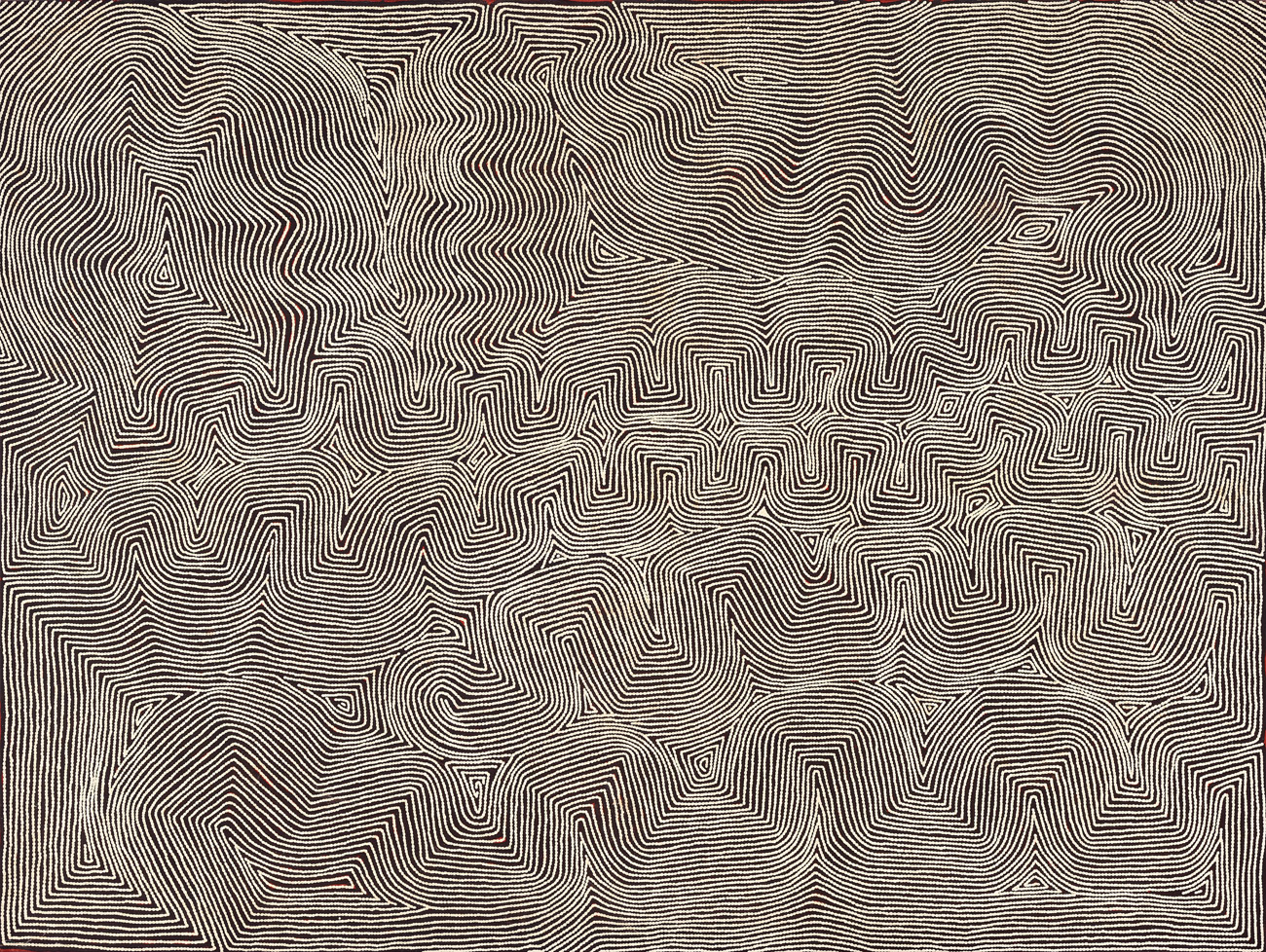 Marawa, 2004, is a distinctive dichromatic painting of interlocking Tingari designs carefully mapped out in Warlimpirrnga’s subtly individual fine, shimmering meandering lines and stippled dots on an ochre and black ground. Pintupi men had a profound influence on the emergence of Western Desert art in Papunya from the early 1970s, with artists such as Ronnie Tjampitjinpa, Uta Uta Tjangala and Antatjari Tjakamarra presenting their sacred stories of Tingari creation of the natural landscape and advocating for their people’s return to country (leading to the establishment of Kintore and Kiwirrkura). These songlines were gradually adapted from and reflected the potency of ritual sand drawings and incised objects. On the most literal level of interpretation, Marawa, like many other Western Desert paintings, is a “map”, a topographical aerial view of ancestral lands combined with a codified mnemonic system of symbols conveying the tjukurrpa and ceremonies associated with this site west of Wilkinkarra (Lake Mackay).