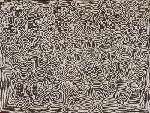 This tight and well-resolved composition is a painting referring this site of rockhole and soakage water from which Warlimpirrnga came, a vast land that he continues to roam to this day. Oral histories speak of the Tingari beings arriving at this site from the west, travelling beneath the earth’s surface to create the ridges and windswept sandhills that unfold across the canvas, pulsating and radiating beyond the physical limits of the rectilinear canvas. While Warlimpirrnga’s abstraction, similar to that of George Tjungurrayi, undoubtedly creates a range of rich optical effects, reminiscent of Western Modernist artworks, the cosmological power of his artworks surpasses their aesthetic and formal qualities. The partial revelation of certain elements of the artist’s tjukurrpa, keeping most hidden from the uninitiated, quietly commands recognition and respect of the persistence and beauty of aboriginal culture, the world’s oldest continual line, and the law that underpins it. Warlimpirrnga’s skill and confidence as a painter has led to global recognition of his work and its stories, with his paintings held in prestigious public collections and exhibited internationally alongside the best examples of contemporary art.