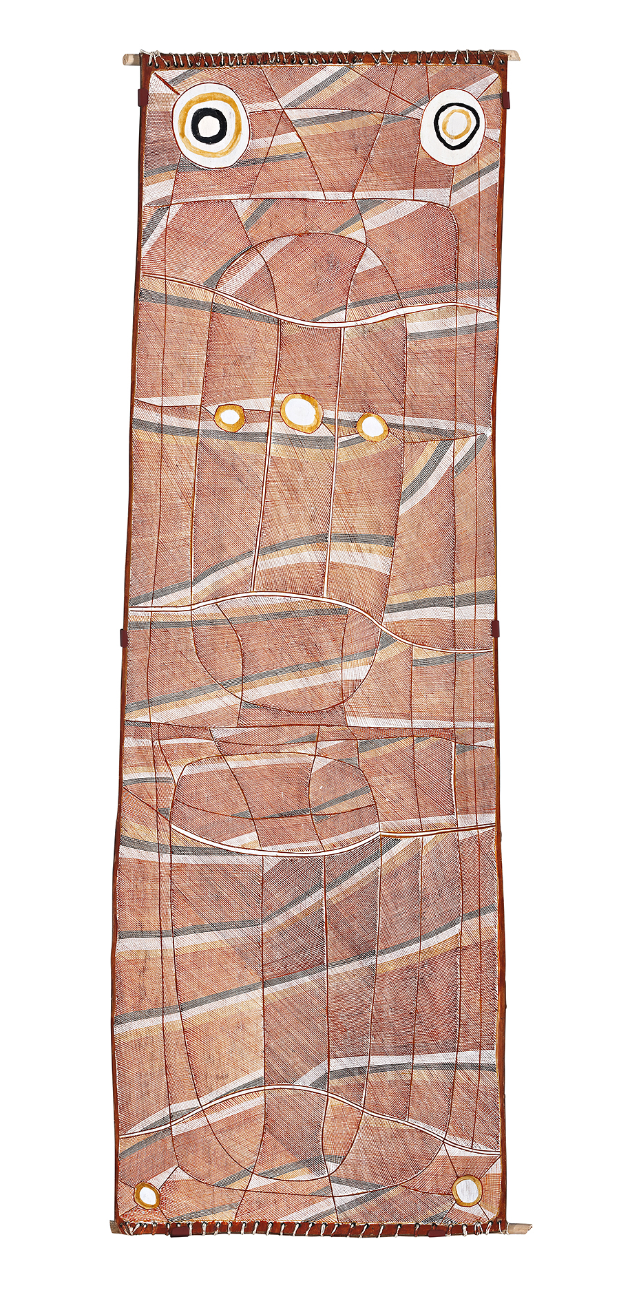 This painting is accompanied by a certificate of authenticity from Maningrida Arts and Culture that states: ‘This work by the artist concerns a major patrimoiety ceremony of a secret and sacred nature called ‘Mardayin’. Much of the meaning of the iconography in the painting is not in the domain of public knowledge and so it cannot be explained in detail here. The painting refers to a site, Kakodbebuldi, which is an outstation in Dangkorlo clan estate in the Mann River region. Kakoddebuldi is a Mardayin ceremony performance site and is located on a large billabong covered in waterlilies. This place is about 50km south of Maningrida in Central North Arnhem Land.’
