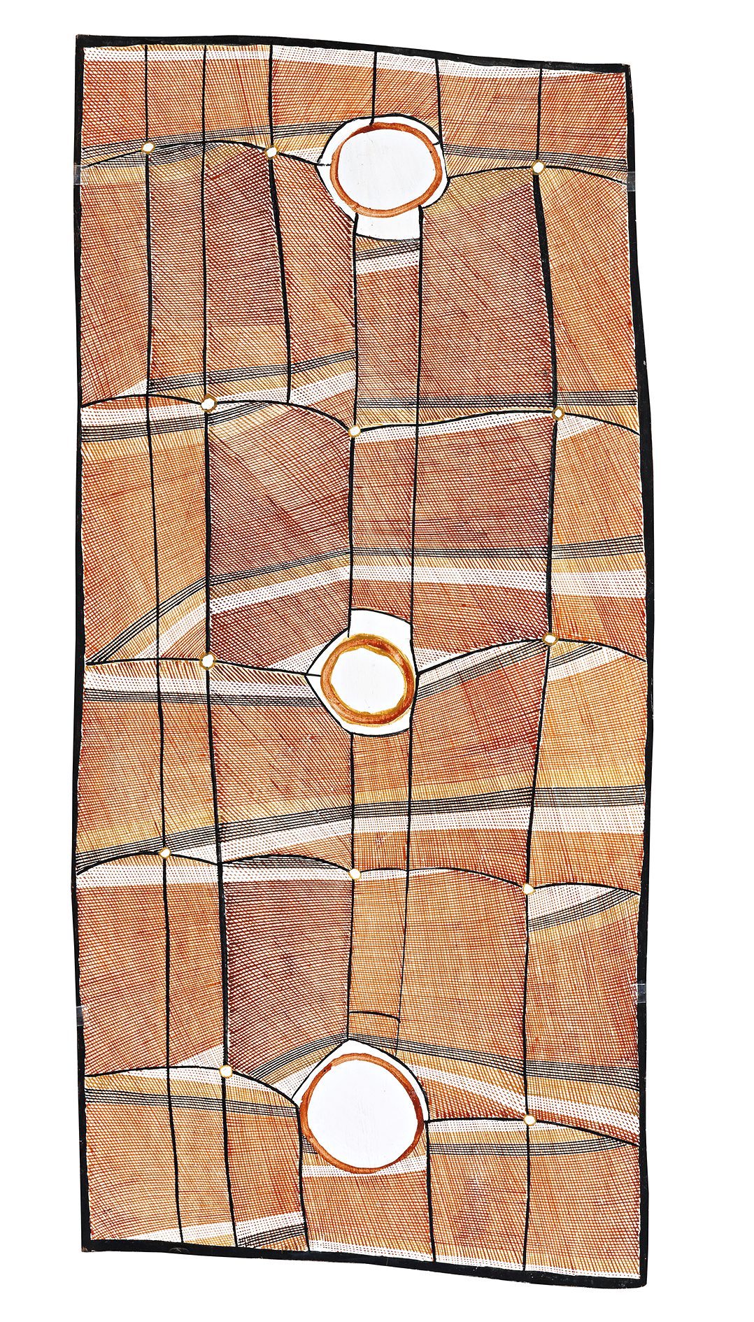 This work is accompanied by a certificate of authenticity from Maningrida Arts and Culture that reads: “This work by the artist concerns a major patrimoiety ceremony of a secret and sacred nature called Mardayin. Much of the meaning of the iconography in the painting is not in the domain of public knowledge and so it cannot be explained in detail. The painting refers to a site, Kakodbebuldi, which is an outstation in the Dangkorlo clan estate in the Mann River region. Kakodbebuldi is a Mardayin ceremony performance site and is located on a large billabong covered in waterlilies. This place is about 50 kilometres south of Maningrida in Central North Arnhem Land.”