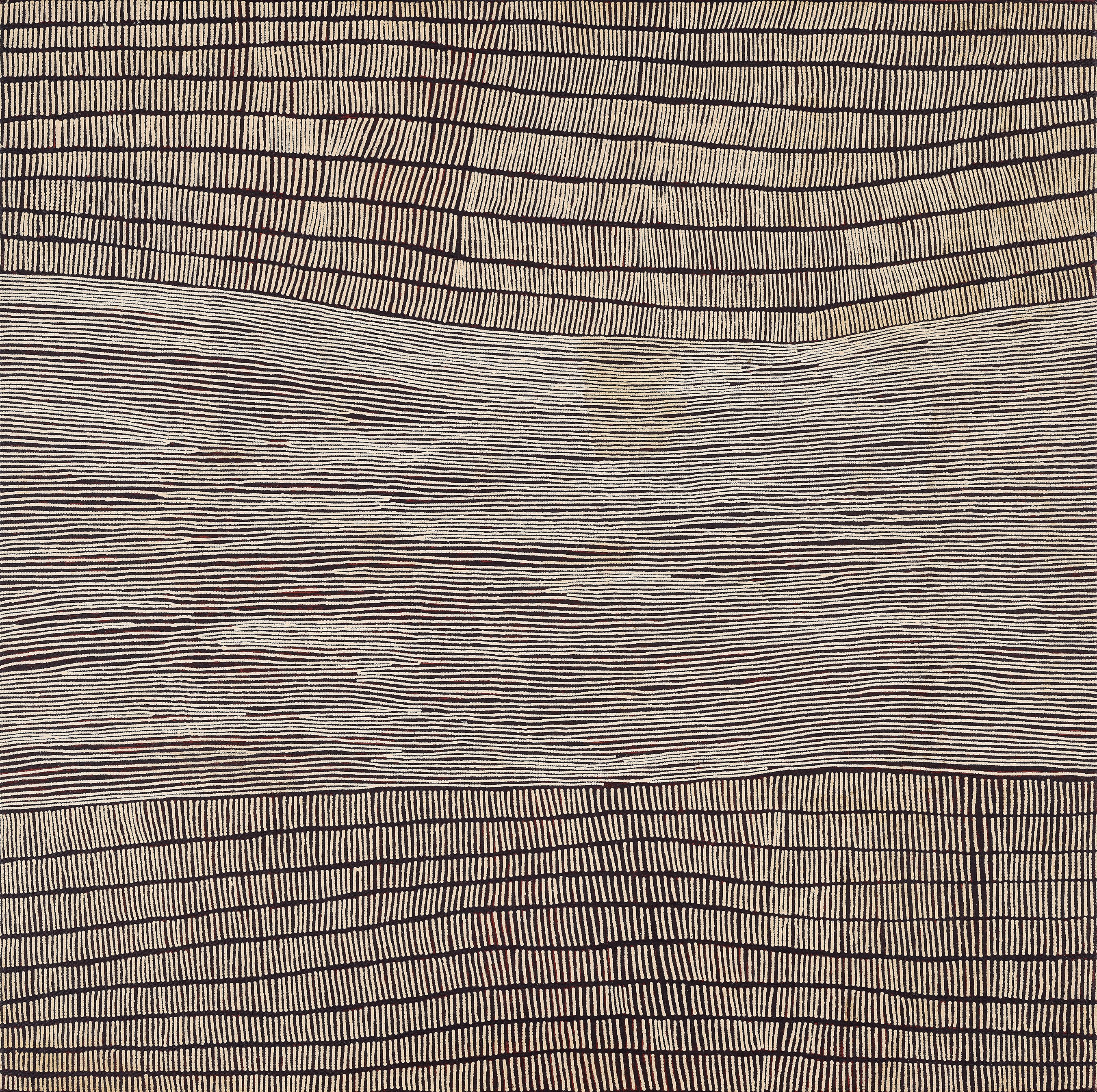 This work is accompanied by a certificate of authenticity from Papunya Tula Artists which states in part: 'This painting depicts designs associated with the rockhole site of Marrapinti, west of the Pollock Hills in Western Australia. The lines in the painting depict the creek at the site and the sandhills which surround it. In Mythological times a group of women of the Nangala and Napangati kinship subsection camped at this site during their travels towards the east.