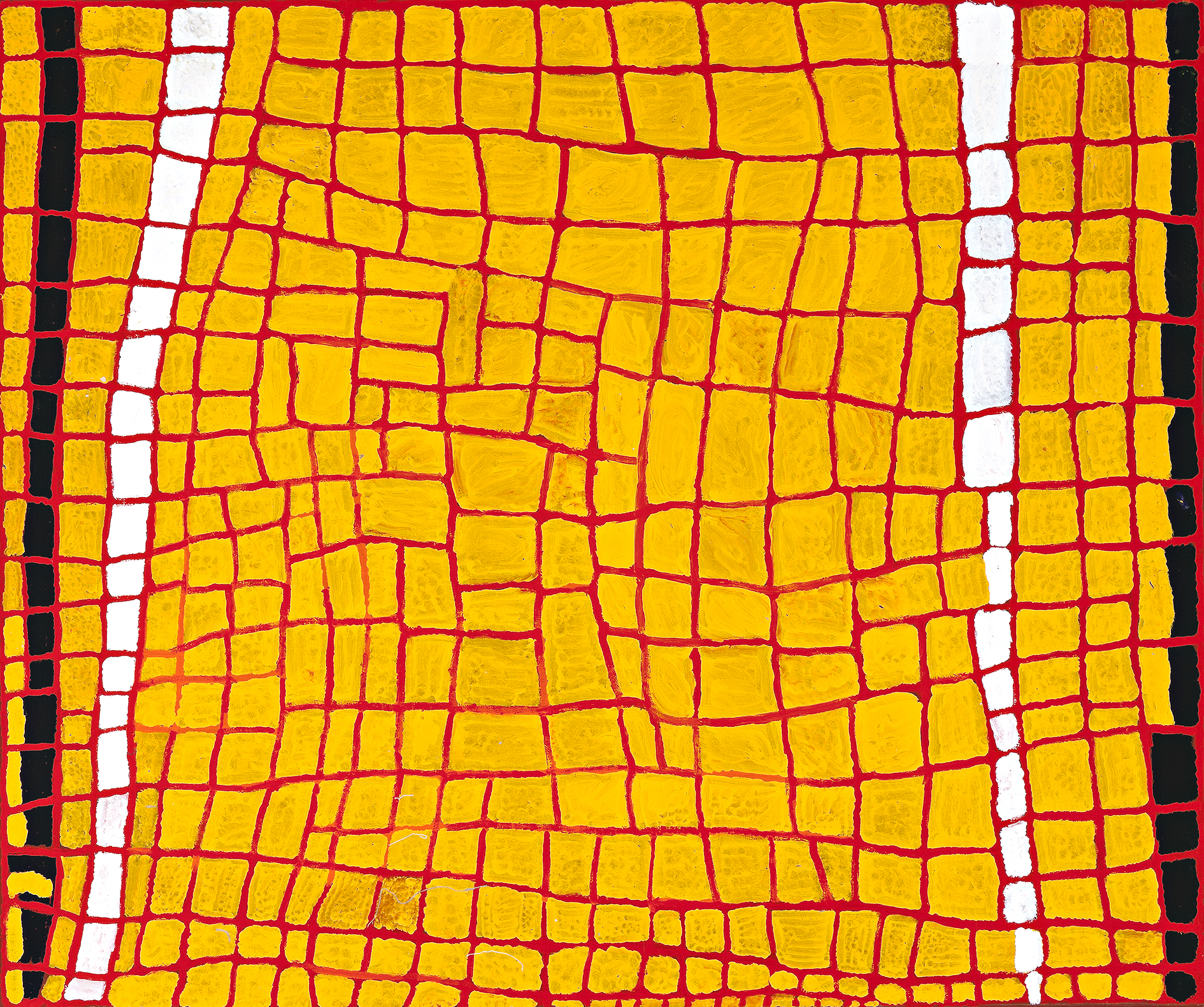 Marruwa is an exceptional example of Tjumpo’s latest style, painted only one year before his death. The vibrant, bright yellow field with a reticulation of red lines depict a traditional map of the artist’s country, whilst the use of only four primary colours with a black and a white band on either side conveys an effect of striking modernity. A smaller closely related painting from the same year housed in the National Gallery of Victoria collection presents an equivalent yellow and red field as found in the current work.