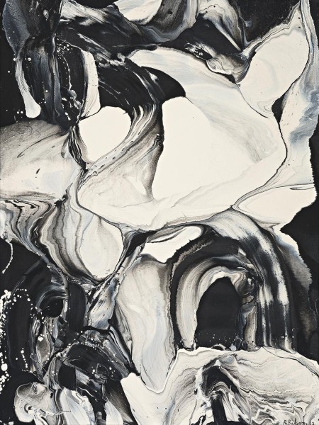 Ralph Balson’s Matter Paintings were perhaps the most radical of his career. In the early 1960s, Balson completely abandoned the cool geometric formalism of his Constructive paintings, and surrendered aesthetic control to follow a spontaneous and semi-automatic style of gestural painting. Throughout his career, he had tirelessly sought a process of abstract painting that would respect the physical qualities of his material while illustrating what he would call the ‘ineffable’,1 the sublime and invisible forces of the universe. This pursuit led him through a disciplined, logical progression of different styles of pure painting – from planar geometric abstraction, to a painterly fragmentation and finally, the ‘Matter Paintings’ whose appearance was entirely governed by the inherent physical properties of poured paint. In this last major series of his career, the artist’s joy in the pure physicality of gesture and material supported the metaphysical underpinnings of his earlier painterly investigations, producing artworks whose swirling surfaces evoke the primordial tohubohu, the formless chaos of all things in the universe, great and small.