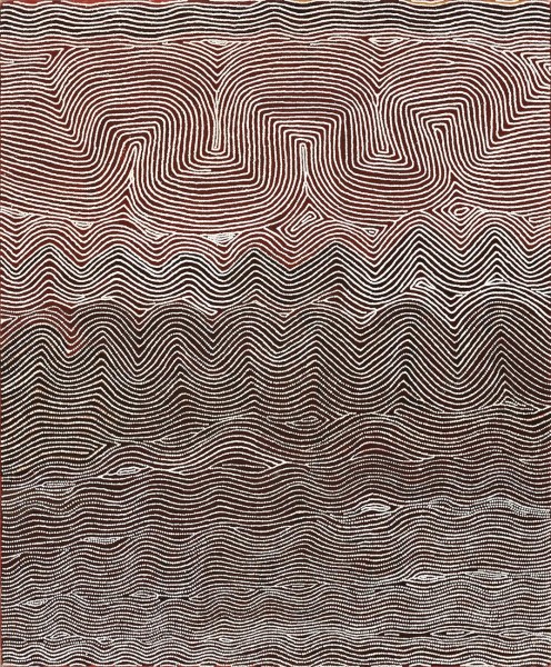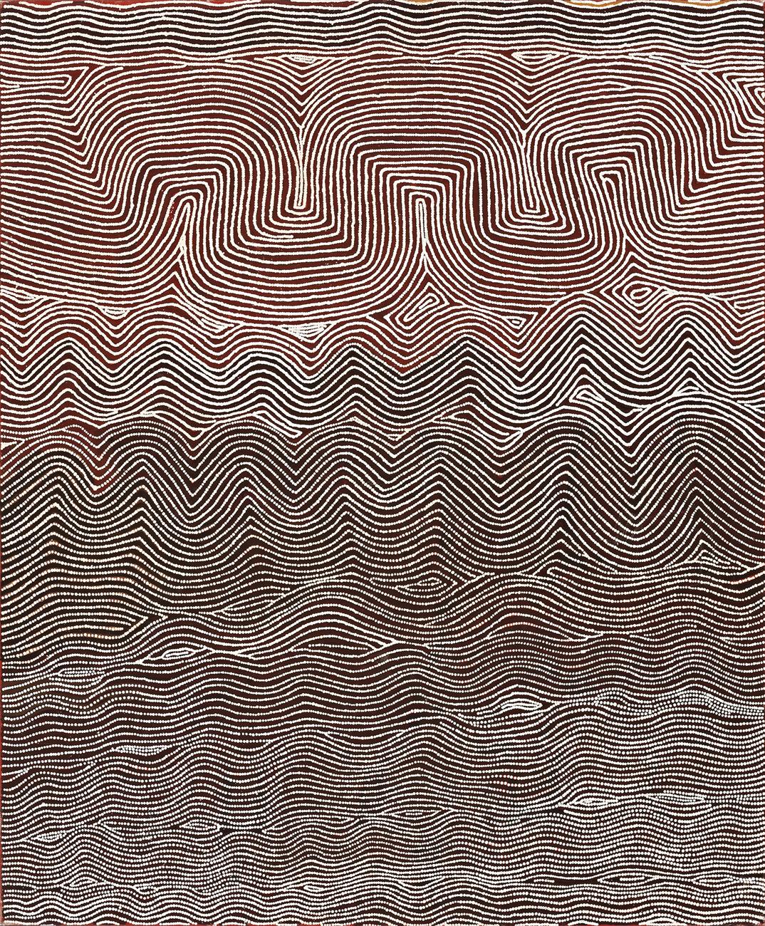 The painting offered here, Maw Maw Yntjipi, 1999, is a captivating interpretation of the landscape that Warlimpirringa criss-crossed in the early part of his life. A swamp and soakage water site south of Wilkinkarra (Lake Mackay), the country visually warps and folds across the surface of the canvas in imitation of the topography of the desert. Waves of sand ridges and dunes are rendered as though viewed in the changing light of the desert, an effect enhanced by the variously-coloured underpainting. Designs constructed of parallel meandering lines and zigzags echo those found incised on wunda shields and pearl shells, a nod to his importance as a maparntjarra or traditional healer and keeper of knowledge.