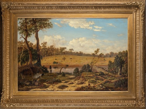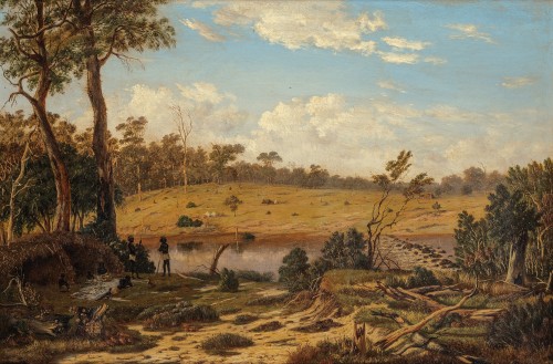 signed and inscribed with title on artist’s label verso: Melbourne as it was in / 1837 from the / Emerald Hill side near the / Falls / Price 5 gns / by H. L. Van den Houten